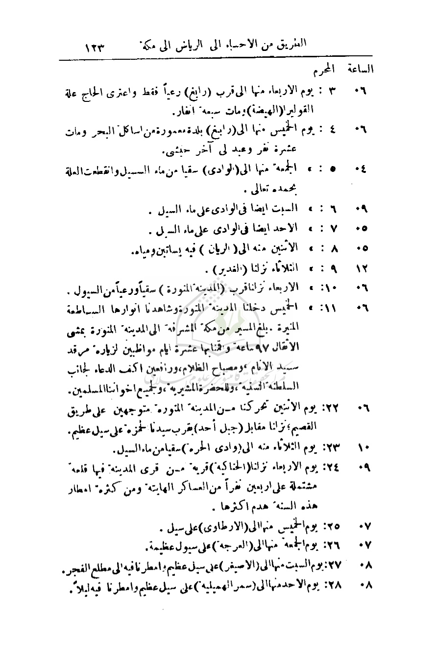 7. 26: يوم الجمعة منها إلى (العرجة) على سيول عظيمة.