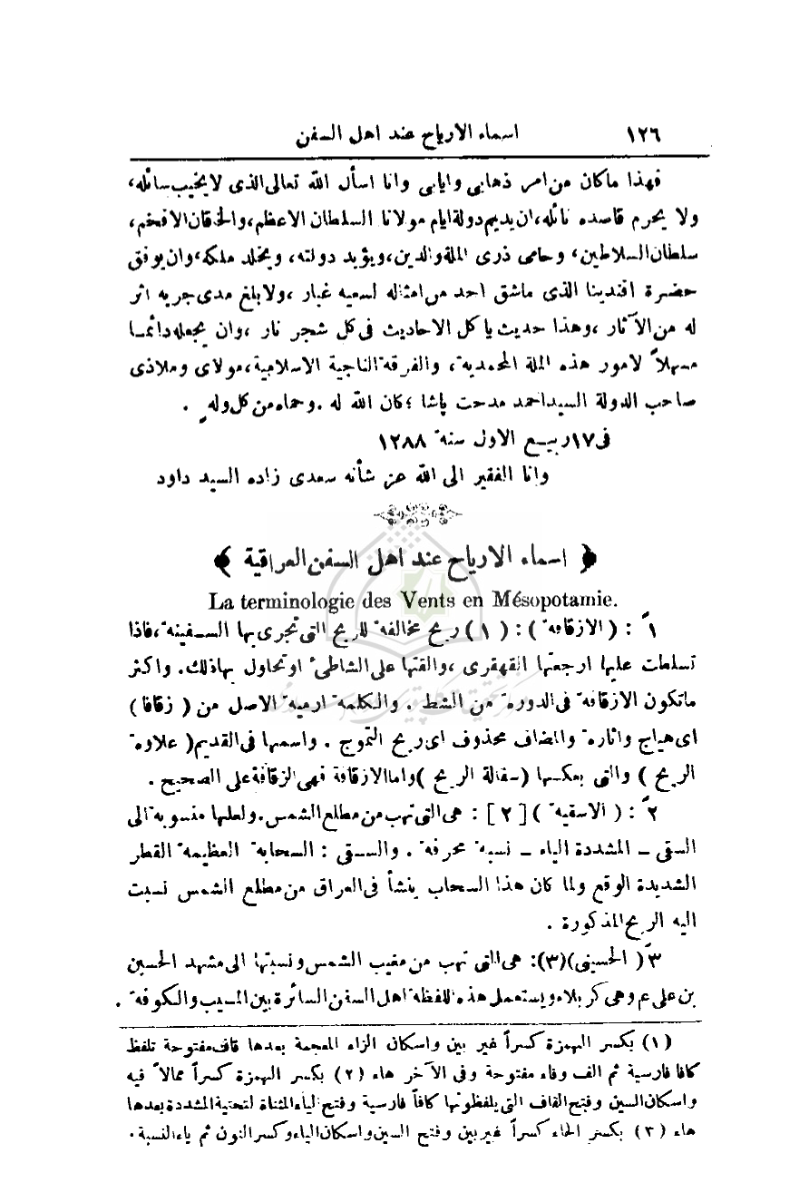 1: (الازقامة) ريح مخالفة للريح التي تجري بها السفينة، فإذا تسلطت عليها أرجعتها القهقري، وألقتها على الشاطئ أو تحاول بها ذلك. وأكثر ما تكون الازقاقة في الدورة من الشط. والكلمة أرمية الأصل من (زقاقا) أي هياج وإثارة والمضاف محذوف أي ربح التموج. وأسمها في القديم (علاوة الريح) والتي بعكسها (سفالة الريح) وأما الازقافة فهي الزقافة على الصحيح.