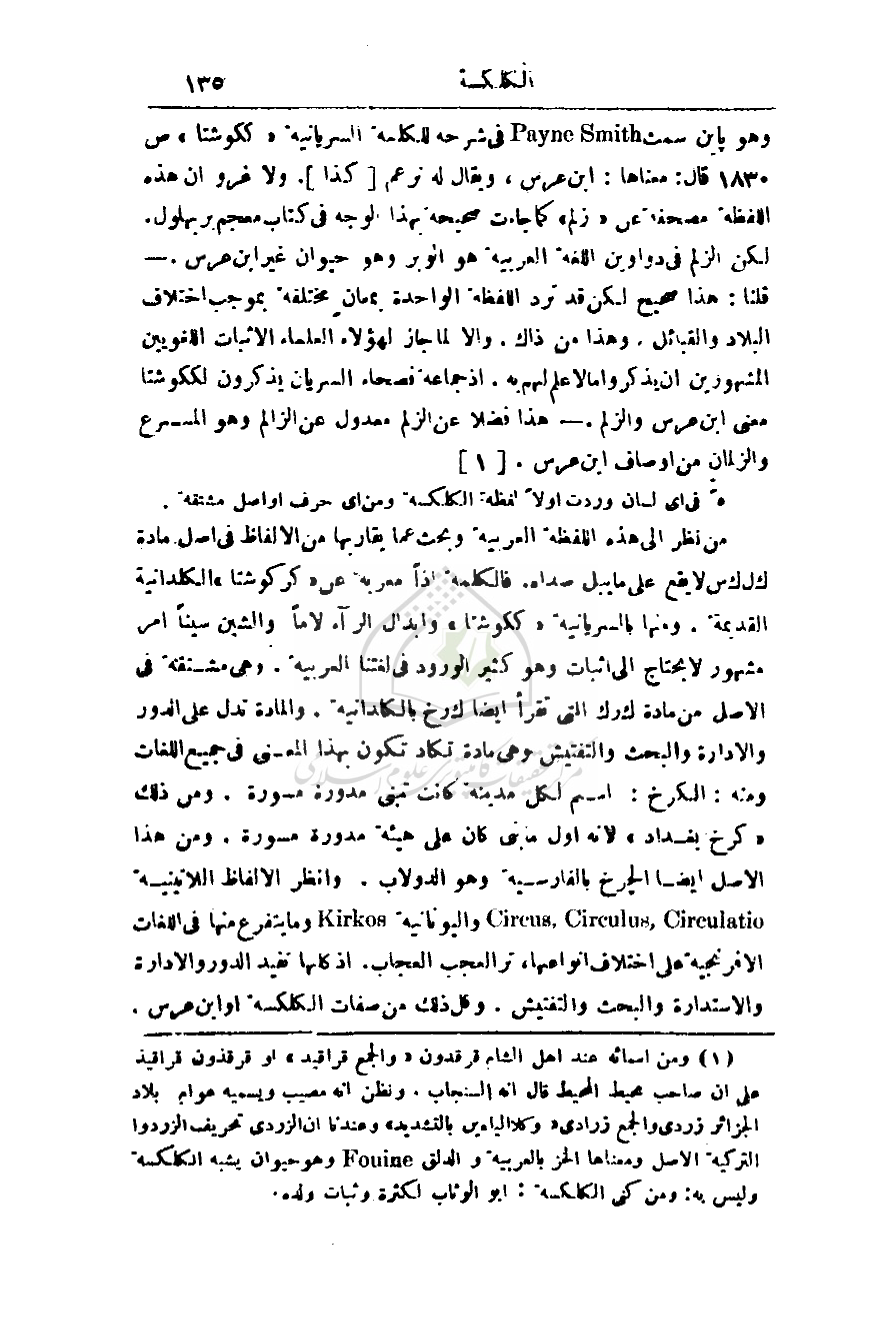 وهو باين سمث في شرحه للكلمة السريانية (ككوشتا) ص 1830 قال: معناها: ابن عرس، ويقال له نرعم (كذا). ولا غرو أن هذه اللفظة مصفحة عن (زلم) كما جاءت صحيحة بهذا الوجه في كتاب معجم بر بهلول. لكن الزلم في دواوين اللغة هو الوبر وهو حيوان غير ابن عرس. - قلنا: هذا صحيح لكن قد ترد اللفظة الواحدة بمعانٍ مختلفة بموجب اختلاف البلاد والقبائل، وهذا من ذاك. وإلا لما جاز لهؤلاء العلماء الإثبات اللغويين المشهورين أن يذكروا ما لا علم لهم به. إذ جماعة فصحاء السريان يذكرون لككوشتا معنى ابن عرس والزلم. - هذا فضلاً عن الزلم معدول عن الزالم وهو المسرع والزلمان من أوصاف ابن عرس.