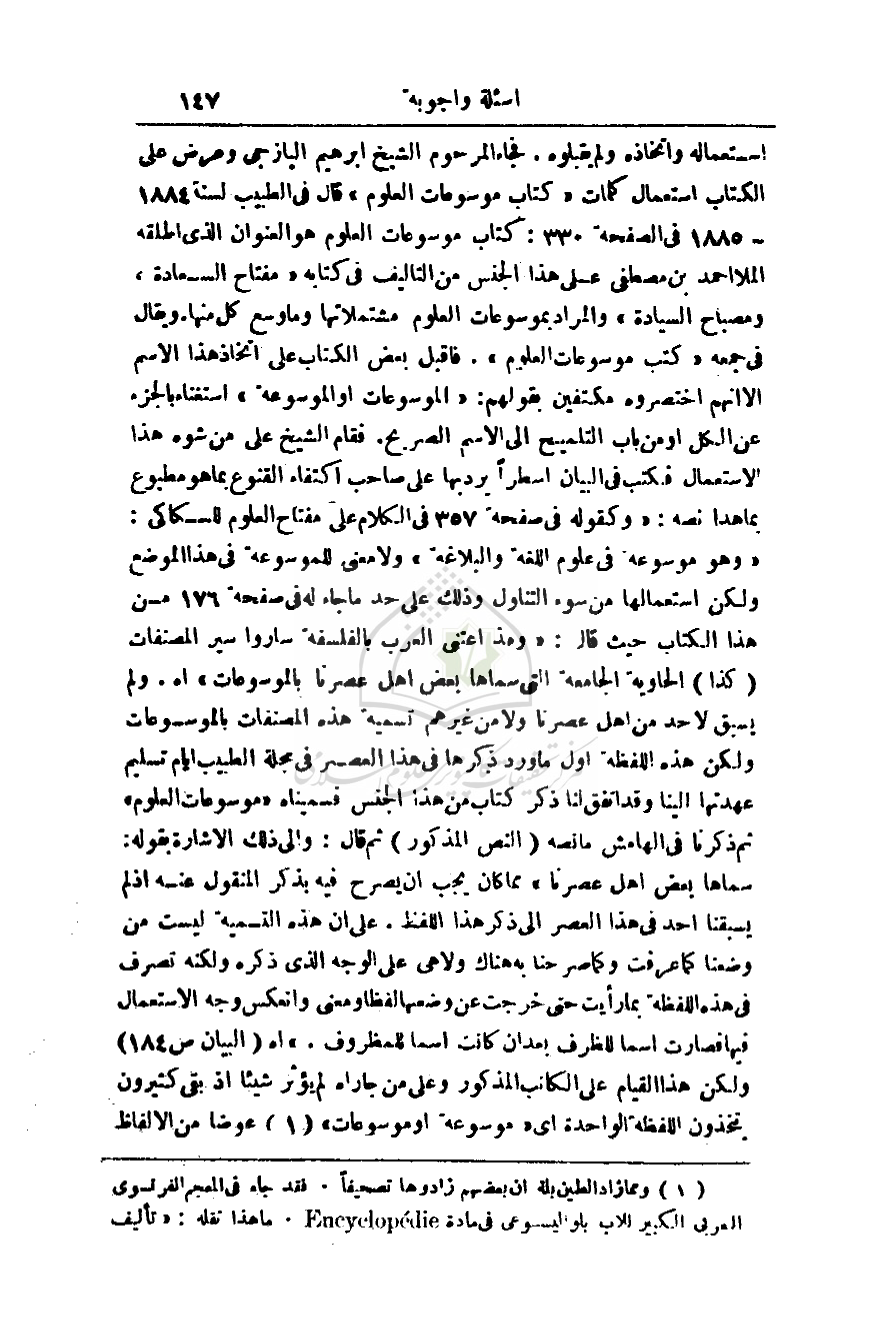استعماله واتخاذه ولم يقبلوه. فجاء المرحوم الشيخ إبراهيم اليازجي وعرض على الكتاب استعمال كلمات (كتاب موسوعات العلوم) قال في الطبيب لسنة 1884 - 1885 في الصفحة 330: كتاب موسوعات العلوم هو العنوان الذي أطلقه الملا أحمد بن مصطفى على هذا الجنس من التأليف في كتابه (مفتاح السعادة، ومصباح السيادة) والمراد بموسوعات العلوم مشتملاتها وما وسع كل منها. ويقال في جمعه (كتب موسوعات العلوم). فأقبل بعض الكتاب على اتخاذ هذا الاسم إلا أنهم اختصروه مكتفين بقولهم: (الموسوعات أو الموسوعة) استغناء بالجزء عن الكل أو من باب التلميح إلى الاسم الصريح. فقال الشيخ على من شوه هذا الاستعمال فكتب في البيان أسطراً يرد بها على صاحب اكتفاء القنوع بما هو مطبوع بما هذا نصه: (وكقوله في صفحة 357 في الكلام على مفتاح العلوم للسكاكي: (وهو موسوعة في علوم اللغة والبلاغة) ولا معنى للموسوعة في هذا الموضع ولكن استعمالها من سوء التناول وذلك على حد ما جاء له في صفحة 176 من هذا الكتاب حيث قال: (ومذ أعتني العرب بالفلسفة ساروا سير المصنفات (كذا) الحاوية الجامعة التي سماها بعض أهل عصرنا بالموسوعات) أهـ. ولم يسبق لأحد من أهل عصرنا ولا من غيرهم تسمية هذه المصنفات بالموسوعات ولكن هذه اللفظة أول ما ورد ذكرها في هذا العصر في مجلة الطبيب أيام تسليم عهدتنا إلينا وقد اتفق لنا ذكر كتاب من هذا الجنس فسميناه (موسوعات العلوم) ثم ذكرنا في الهامش ما نصه (النص المذكور) ثم قال: وإلى ذلك الإشارة بقوله: سماها بعض أهل عصرنا) مما كان يجب أن يصرح فيه بذكر المنقول عنه إذ لم يسبقنا أحد في هذا العصر إلى ذكر هذا اللفظ. على أن هذه التسمية ليست من وضعنا
