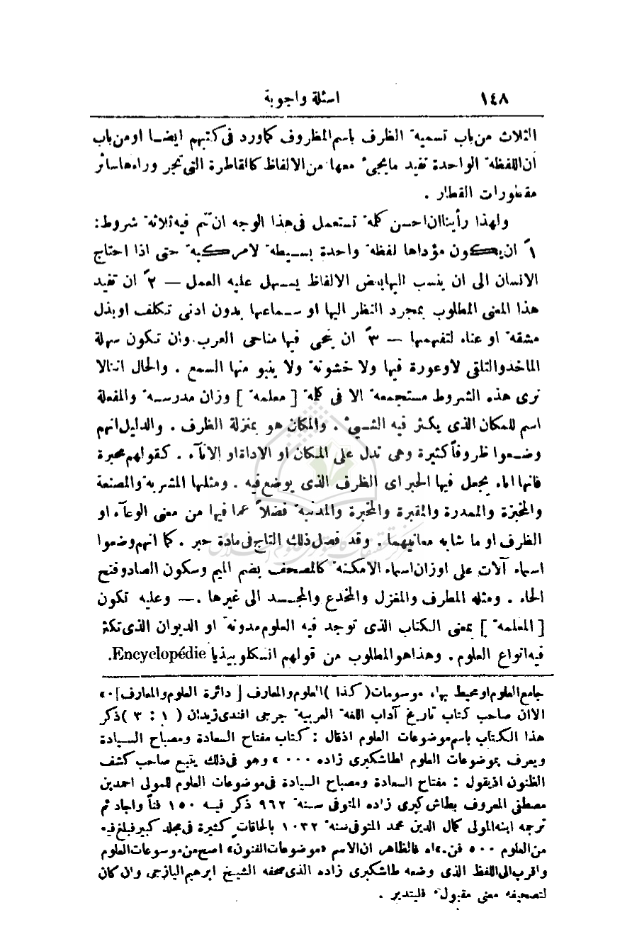 ولهذا رأينا أن أحسن كلمة تستعمل في هذا الوجه أن تتم فيه ثلاثة شروط: 1ً أن يكون مؤداها لفظة واحدة بسيطة لا مركبة حتى إذا أحتاج الإنسان إلى أن ينسب إليها بعض الألفاظ يسهل عليه العمل - 2ً أن تفيد هذا المعنى المطلوب بمجرد النظر إليها أو سماعها بدون أدنى تكلف أو بذل مشقة أو عناء لتفهمها - 3ً أن ينحى فيها مناحي العرب وأن تكون سهلة المأخذ والتلقي لا وعورة فيها ولا خشونة ولا ينبو منها السمع. والحال أننا لا نرى هذه الشروط مستجمعة إلا في كلمة (معلمة) وزان مدرسة والمفعلة اسم للمكان الذي يكثر فيه الشيء. والمكان هو بمنزلة الظرف. والدليل إنهم وضعوا ظروفاً كثيرة وهي تدل على المكان أو الأداة أو الإناء. كقولهم محبرة فإنها إناء يجعل فيها الحبر أي الظرف الذي يوضع فيه. ومثلها المشربة أو المصنعة والمخبزة والممدرة والمقبرة والمخبرة والمدنبة فضلاً عما فيها من معنى الوعاء أو الظرف أو ما شابه معانيهما. وقد فصل ذلك التاج في مادة حبر. كما إنهم وضعوا أسماء آلات على أوزان أسماء الأمكنة كالمصحف بضم الميم وسكون الصاد وفتح الحاء. ومثله المطرف والمغزل والمخدع والمجسد إلى غيرها. - وعليه تكون (المعلمة) بمعنى الكتاب الذي توجد فيه العلوم مدونة أو الديوان الذي تكثر فيه أنواع العلوم. وهذا هو المطلوب من قولهم السكلوبيذيا