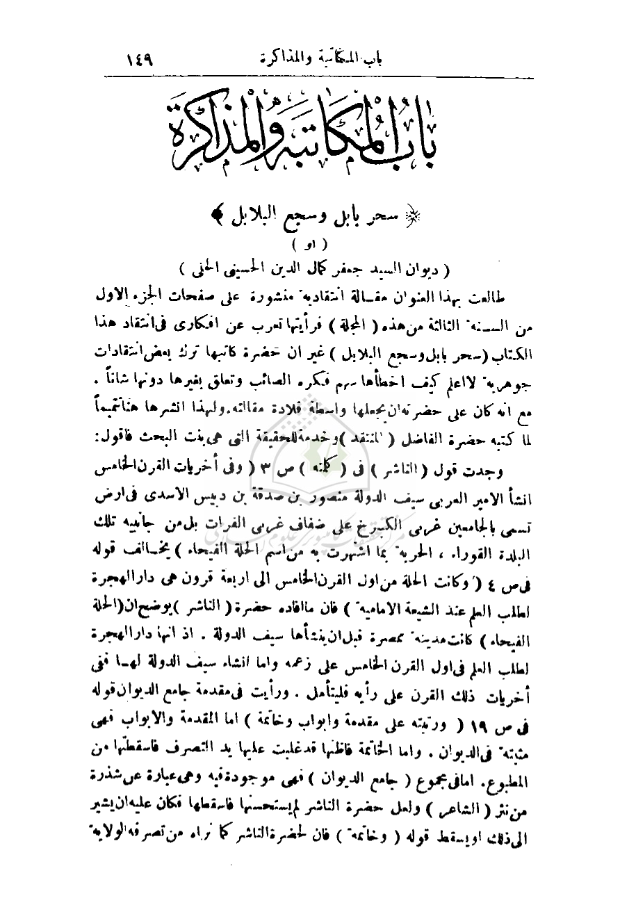 وجدت قول (لناشر) في (كلمته) ص 3 (وفي أخريات القرن الخامس انشأ الأمير العربي سيف الدولة منصور بن صدقة بن دبيس الأسدي في أرض تسمى بالجامعين غربي الكرخ على ضفاف غربي الفرات بل من جانبيه تلك البلدة القوراء، الحرية بما اشتهرت به من اسم الحلة الفيحاء) يخالف قوله في ص 4 (وكانت الحلة من أول القرن الخامس إلى أربع قرون هي دار الهجرة لطلب العلم عند الشيعة الأمامية) فإن ما أفاده حضرة (الناشر) يوضح أن (الحلة الفيحاء) كانت مدينة ممصرة قبل أن ينشأها سيف الدولة. إذ أنها دار الهجرة لطلب العلم في أول القرن الخامس على زعمه وأما إنشاء سيف الدولة لها ففي أخريات ذلك القرن على رأيه فليتأمل. ورأيت في مقدمة جامع الديوان قوله في ص 19 (ورتبته على مقدمة وأبواب وخاتمة) أما المقدمة والأبواب فهي مثبتة في الديوان. وأما الخاتمة فأظنها قد غلبت عليها يد التصرف فأسقطتها من المطبوع. أما في مجموع (جامع الديوان) فهي موجودة فيه وهي عبارة عن شذرة من نثر (الشاعر) ولعل حضرة الناشر لم يستحسنها فأسقطها فكان عليه أن يشير إلى ذلك أو يسقط قوله (وخاتمة) فإن حضرة الناشر كما نراه من تصرفه الولاية