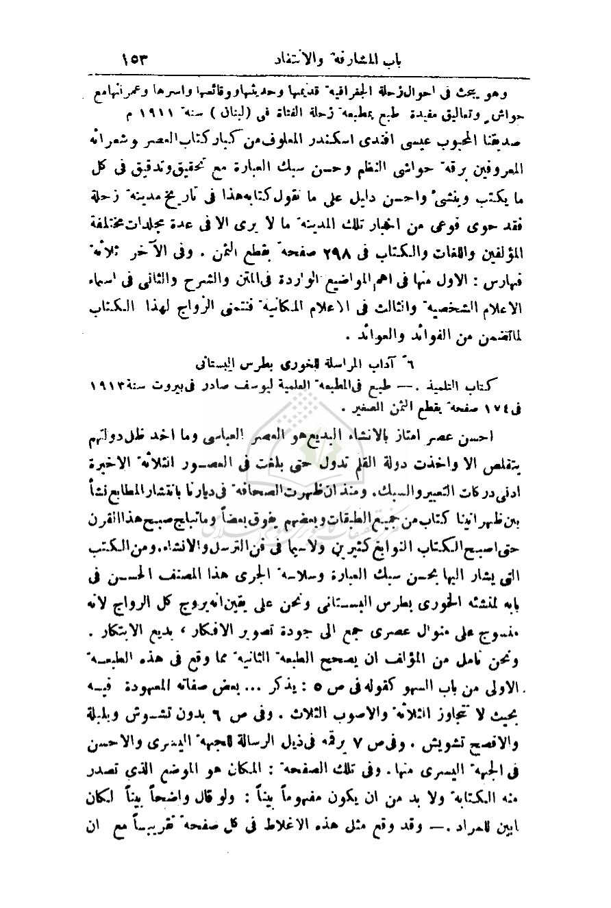 أحسن عصر امتاز بالإنشاء البديع هو العصر العباسي وما أخذ ظل دولتهم يتقلص إلا وأخذت دولة القلم تدول حتى بلغت في العصور الثلاثة الأخيرة أدنى دركات التعبير والسبك. ومنذ أن ظهرت الصحافة في ديارنا بانتشار المطابع نشأ بين ظهرانينا كتاب من جميع الطبقات وبعضهم يفوق بعضاً وما تبلج صبح هذا القرن حتى أصبح الكتاب النوابغ كثيرين ولا سيما في فن الترسل والإنشاء. ومن الكتب التي يشار إليها بحسن السبك العبارة وسلاسة الجري هذا المصنف الحسن في بابه لمنشئه الخوري بطرس البستاني ونحن على يقين أنه يروج كل الرواج لأنه منسوج على منوال عصري جمع إلى جودة تصوير الأفكار، بديع الابتكار. ونحن نأمل من المؤلف أن يصحح الطبعة الثانية مما وقع في هذه الطبعة الأولى من باب السهو كقوله في ص 5: يذكر. . . بعض صفاته المعهودة فيه بحيث لا تتجاوز الثلاثة والأصوب الثلاث. وفي ص 6 بدون تشوش وبلبلة والأفصح تشويش. وفي ص 7 يرقمه في ذيل الرسالة للجهة اليسرى والأحسن في الجهة اليسرى منها. وفي تلك الصفحة: المكان هو الموضع الذي تصدر منه الكتابة ولا بد من أن يكون مفهوماً بيناً: ولو قال واضحاً بيناً لكان أبين للمراد. - وقد وقع مثل هذه الأغلاط في كل صفحة تقريباً مع أن