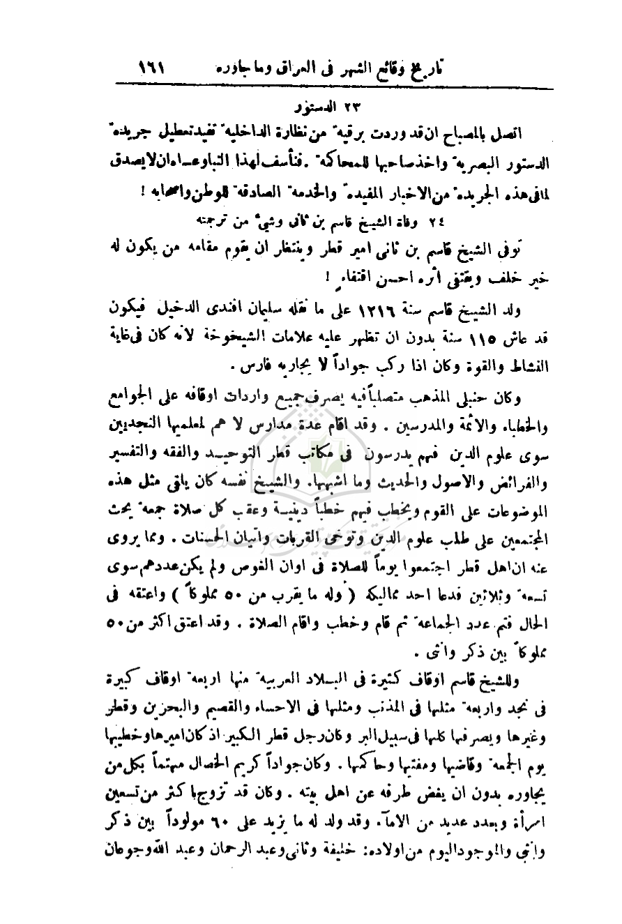 اتصل بالمصباح أن قد وردت برقية من نظارة الداخلية تفيد تعطيل جريدة الدستور البصرية وأخذ صاحبها للمحاكمة. فنأسف لهذا النبأ وعساه أن لا يصدق لما في الجريدة من الأخبار المفيدة والخدمة الصادقة للوطن وأصحابه!