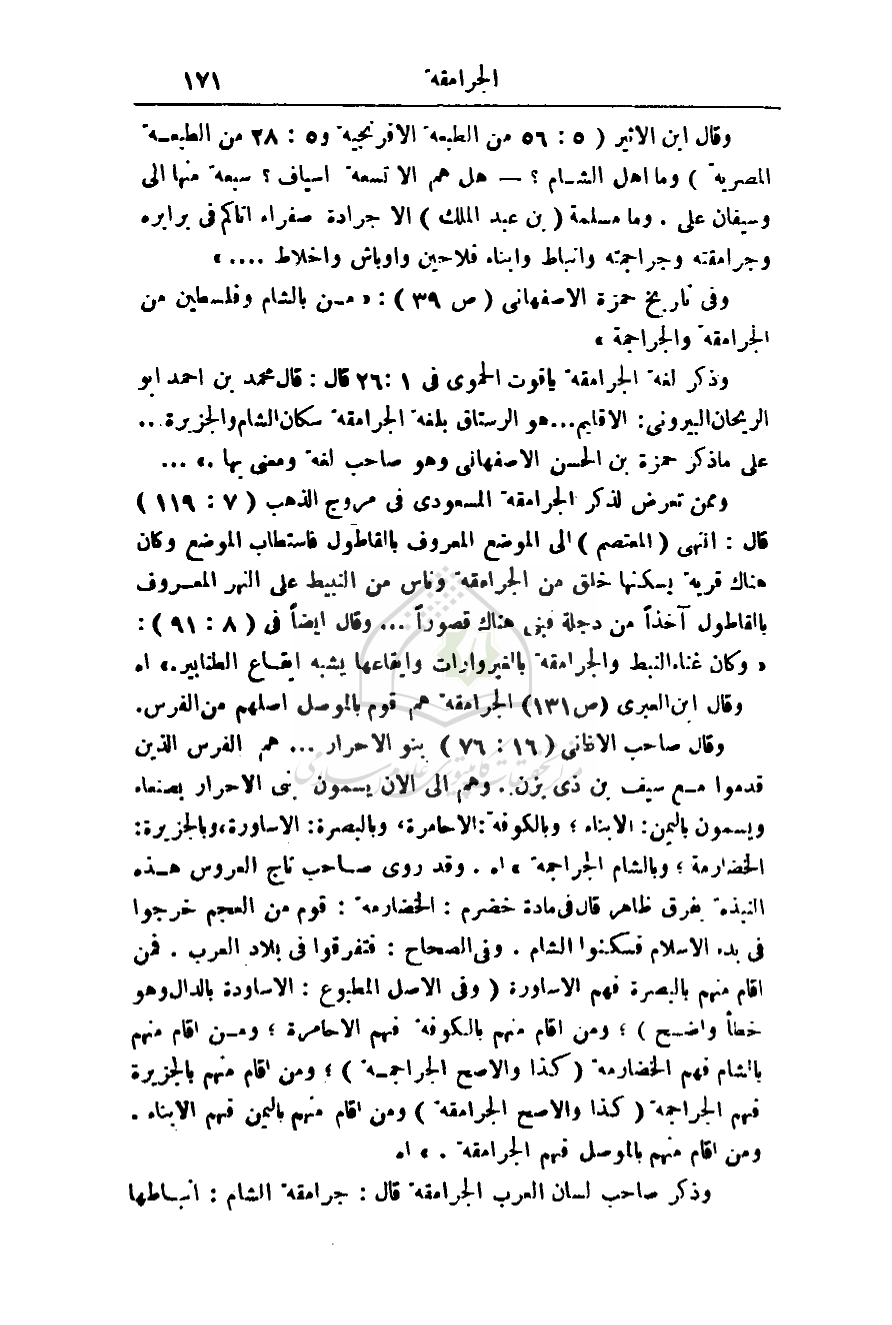 وفي تاريخ حمزة الأصفهاني (ص 39): (من بالشام وفلسطين من الجرامقة والجراجمة)