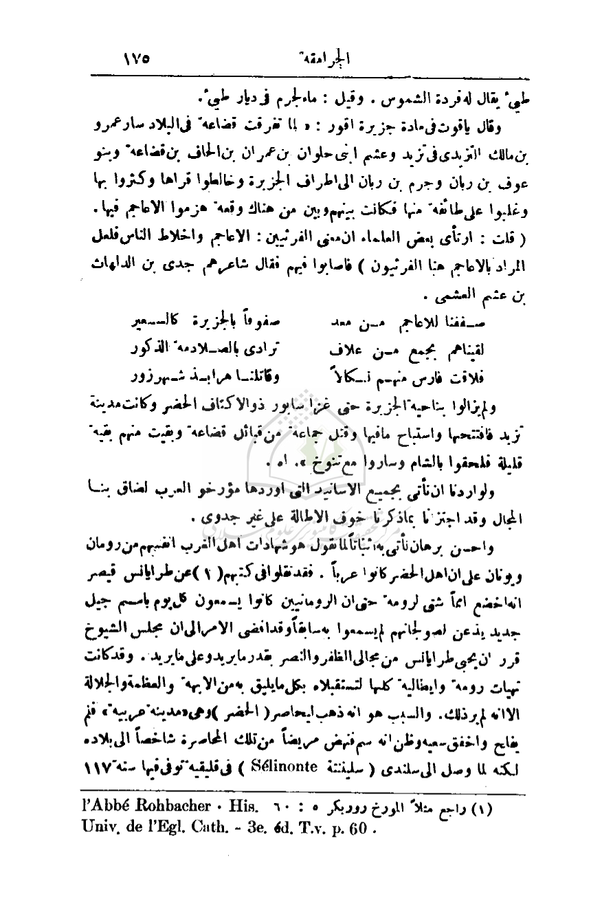 وقال ياقوت في مادة جزيرة اقور: (لما تفرقت قضاعة في البلاد سار عمرو بن مالك التزيدي في تزيد وعشم ابني حلوان بن عمران بن الحاف بن قضاعة وبنو عوف بن ربان وجرم بن ربان إلى أطراف الجزيرة وخالطوا قراها وكثروا بها وغلبوا على طائفة منها فكانت بينهم وبين من هناك وقعة هزموا الأعاجم فيها. (قلت: ارتأى بعض العلماء أن معنى الفرثيين: الأعاجم وأخلاط الناس فلعل المراد بالأعاجم هنا الفرثيون) فأصابوا فيهم فقال شاعرهم جدي بن الدلهات بن عشم العشمي.