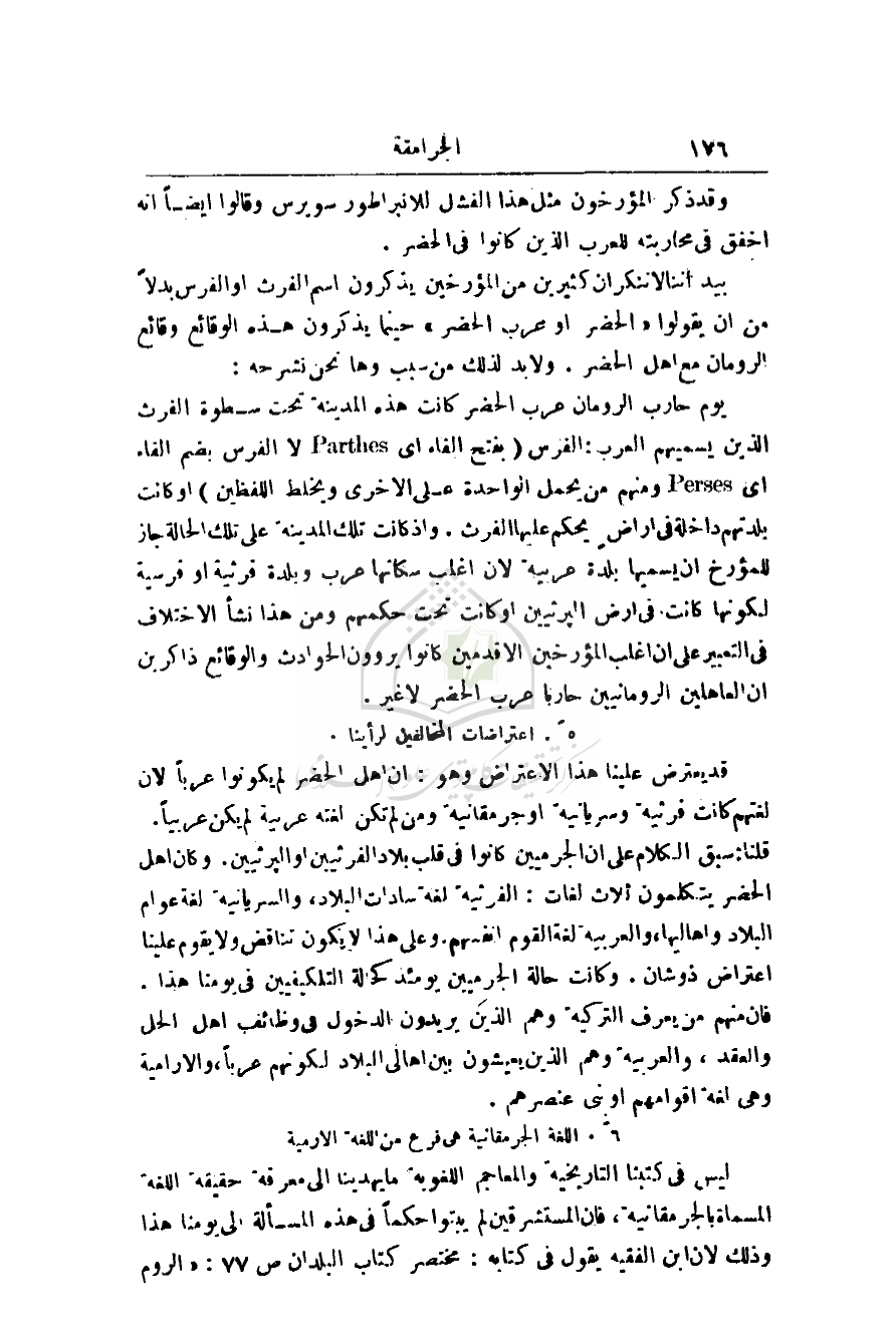 فرثية وسريانية أو جرمقانية ومن لم تكن لغته عربية لم يكن عربياً. قلنا: سبق الكلام على أن الجرميين كانوا في قلب بلاد الفرثيين أو البرثيين. وكان أهل الحضر يتكلمون ثلاث لغات: الفرثية لغة سادات البلاد، والسريانية لغة عوام البلاد وأهاليها، والعربية لغة القوم أنفسهم. وعلى هذا لا يكون تناقض ولا يقوم علينا اعتراض ذو شان. وكانت حالة الجرميين يومئذ كحالة التلكيفيين في يومنا هذا. فإن منهم من يعرف التركية وهم الذين يريدون الدخول في وظائف أهل الحل والعقد، والعربية وهم الذين يعيشون بين أهالي البلاد لكونهم عرباً، والآرامية وهي لغة أقوامهم أو بني عنصرهم.