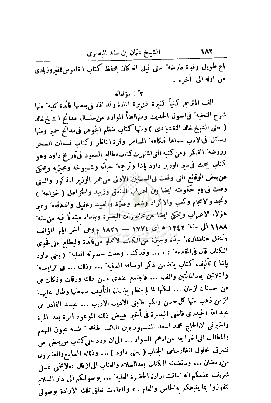 ألف المترجم كتباً كثيرة غزيرة المادة وقد أفاد في بعضها فائدة كلية منها شرح النخبة في أصول الحديث ومنها اهنأ الموارد من سلسال مدائح الشيخ خالد (يعني الشيخ خالد النقشبندي) ومنها كتاب منظم الجوهر في مدائح حمير ومنها رسائل في الأدب سماها فكاهة السامر وقرة الناظر وكتاب نسمات السحر وروضة الفكر ومن كتبه التي اشتهرت كتاب مطالع السعود في تاريخ داود وهو كتاب يبحث في سير الوزير داود باشا وترجمة حياته وشيوخه ومجيز به ويحكي بعض الوقائع التي وقعت في السنين الأولى من عمر الوزير المذكور والتي وقعت في أيام حكومته أيضاً بين أعراب المتفق وزبيد والخزاعل (خزاعة) ونجد والأعجام وكعب والأكراد وشمر وعنزة والعبيد وعقيل والدفافعة وغير هؤلاء الأعراب ويحكي أيضاً عن محاصرات البصرة وبغداد مبتدئاً فيه من سنة 1188 إلى سنة 1242هـ أي 1774 - 1826م وهي آخر أيام المؤلف وننقل هنا للقارئ نبذة وجيزة من الكتاب لا تخلو من فائدة وليطلع على فحوى الكتاب قال في المقدمة: (. . . وقد كنت وعدت حضرته العلية (يعني داود باشا) تأليف كتاب يتضمن ذكر أوصافه السنية. . . وذلك. . . في الرابعة والثلاثين بعد المائتين وألف. . . فاجتمع عندي من ذلك ورقات ونكات هي من حسنات الزمان. . . لكنها لما لم ينظم ببيان التأليف سمطها وطال عليها الزمن ذهب منها كل حسن ولكم عاتبني الأديب الأريب. . . عبد القادر بن عبد الله الحيدري قاضي البصرة في تأخير تبييض ذلك الموعود المرة بعد المرة وأخبرني إن الحاج محمد أسعد المشهور بابن النائب طامح منه عيون الهمم والمطالب إلى إخراجه من أدهم السواد. . . إلى أن ورد كتاب من بعض من تشرف بحلول أنظار سامي الجناب (يعني داود). . . وذلك في السابع والعشرين من رمضان. . . وما تضمنه الكتاب بعد السلام والعتاب إلى أن قال: (لا يخفى على شريف علمكم أنه تعلقت إرادة الحضرة العلية. . . بوصولكم إلى دار السلام لتفوزوا بما يغبطكم به الخاص والعام.) ولما علمت تعلق تلك الإرادة بوصولي