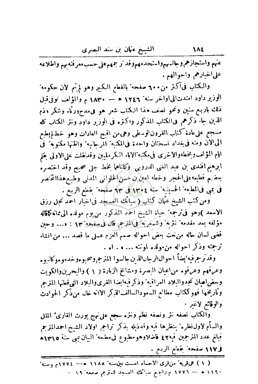 والكتاب في أكثر من 600 صفحة بالقطع الكبير وهو لم يتم لأن حكومة الوزير داود امتدت إلى أواخر سنة 1246هـ - 1830م والمؤلف توفى قبل ذلك بأربع سنين ونحو نصف هذا الكتاب شعر هو في مدح ورثاء وشكر وذم الذين جاء ذكرهم في الكتاب المذكور وأكثره في الوزير داود ونثر الكتاب كله مسجع على عادة كتاب القرون الوسطى وهي من أقبح العادات وهو خط لم يطبع إلى الآن ومنه في بغداد نسختان واحدة في المكتبة المرجانية وأظنها مكتوبة في أيام المؤلف وبخطه والأخرى في مكتبة الأباء الكرمليين وقد نقلت على الأولى بقلم إبراهيم أفندي بن عبد الغني الدروبي وكلتاهما بخط جلي صحيح وقد اختصره بعضهم فطبعه على الحجر وخطه أمين بن حسن الحلواني المدني وطبع هذا المختصر في بمبي في المطبعة الحسينية سنة 1304 في 63 صفحة بقطع الربع.