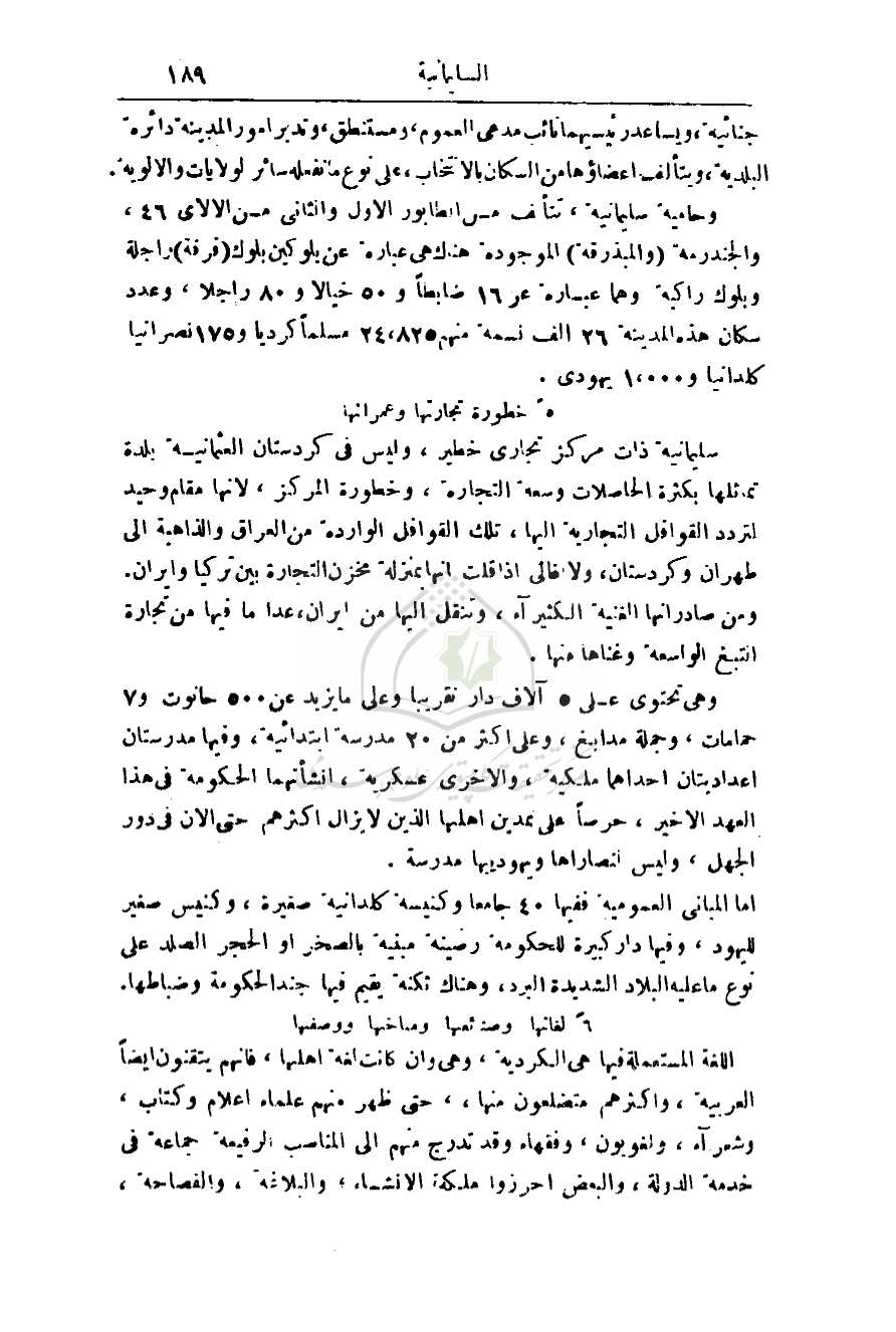 وحامية سليمانية، تتألف من الطابور الأول والثاني من الالاي 46، والجندرمة (والمبذرقة) الموجودة هناك هي عبارة عن بلوكين بلوك (فرقة) راجلة وبلوك راكبة وهما عبارة عن 16 ضابطاً و50 خيالاً و80 راجلاً، وعدد سكان هذه المدينة 26 ألف نسمة منهم 24. 825 مسلماً كردياً و175 نصرانياً كلدانياً و1. 000 يهودي.