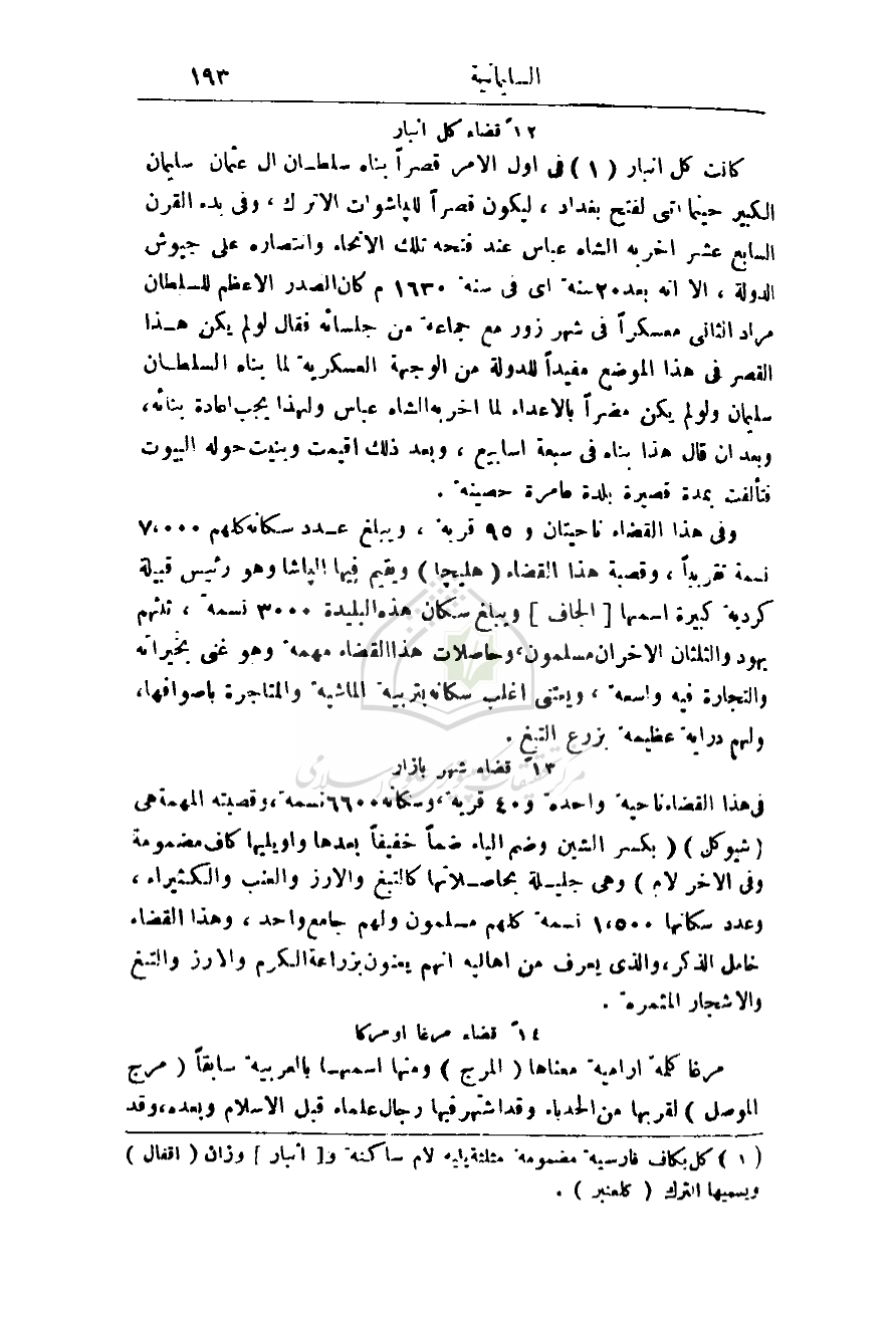 وفي هذا القضاء ناحيتان و95 قرية، ويبلغ عدد سكانه كلهم 7. 000 نسمة تقريباً، وقصبة هذا القضاء (هليجا) ويقيم فيها الباشا وهو رئيس قبيلة كردية كبيرة اسمها (الجاف) ويبلغ سكان هذه البليدة 3000 نسمة، ثلثهم يهود والثلثان الآخران مسلمون، وحاصلات هذا القضاء مهمة وهو غني بخيراته والتجارة فيه واسعة، ويعتني اغلب سكانه بتربية الماشية والمتاجرة بأصوافها، ولهم دراية عظيمة بزرع التبغ.