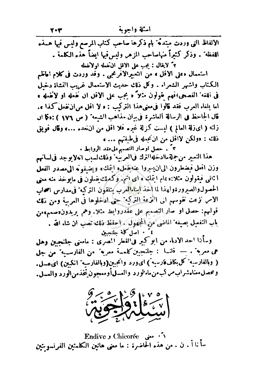استعمال (على الأقل) من التعبير الإفرنجي. وقد وردت في كلام أعاظم الكتاب وأشهر الشعراء. وكل ذلك حديث الاستعمال غريب النشأة دخيل في اللغة الفصحى؛ فهم يقولون مثلاً (يجب على الأقل أن تفعله أو لا تفعله) أما بلغاء العرب فقد قالوا في معنى هذا التركيب: (لا أقل من أن نفعل كذا). قال الجاحظ في الرسالة العاشرة في بيان مذاهب الشيعة (ص 176): (كما إن زلته (أي زلة العالم) ليست كزلة غيره فلا أقل من أن نعده. . .) وقال فويق ذلك: (ولكن لا أقل من أن نجعله في طبقتهم. . .)