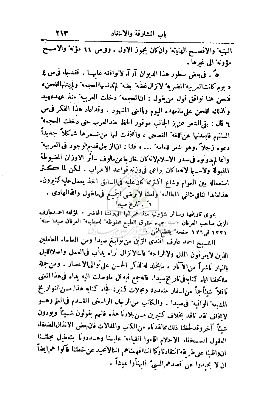 يحوي تاريخها وسائر شؤونها منذ عمرانها إلى وقتنا الحاضر. لمؤلفه أحمد عارف الزين صاحب العرفان. - جميع حقوق الطبع محفوظة له مطبعة العرفان صيدا سنة 1331 في 176 صفحة بقطع الثمن.
