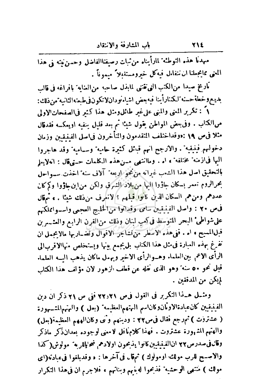 1 - تكرير المعنى والمبنى على غير طائل ومثل هذا كثير في الصفحات الأولى من الكتاب. وفي بعض المواطن يقول شيئاً ثم بعد قليل ينفيه أو يعكسه فقد قال مثلا في ص 19: (وقد اختلف المتقدمون والمتأخرون في أصل الفينيقيين وزمان دخولهم فينيقية. والأرجح إنهم قبائل كثيرة حامية وسامية وقد هاجروا إليها في أزمنة مختلفة) اه. وما انتهى من هذه الكلمات حتى قال: إنه لا يعلم بالتحقيق أصل هذا الشعب غير أنه من نحو أربعة آلاف سنة أخذت سواحل بحر الروم تعمر بسكان جاءوا إليها من بلاد الشرق ولكن من أين جاءوا وكم كان عددهم ومن هم السكان الذين كانوا قبلهم؟ لا نعرف من ذلك شيئاً.) ثم قال في ص 20: وأصل الفينيقيين سامي وقد أتوا من الخليج العجمي وأسوا مملكتهم على شواطئ البحر المتوسط في كعب لبنان وذلك من القرن الرابع والعشرين قبل المسيح) اه.
