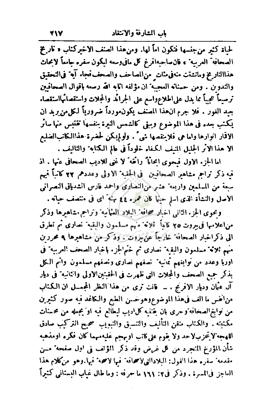 لحياة كثير من جنسها فتكون أماً لها. ومن هذا الصنف الأخير كتاب (تاريخ الصحافة العربية) فإن صاحبه أفرغ كل ما في وسعه ليكون سفره جامعاً لأبحاث هذا التاريخ وما تشتت منه في مئاتٍ من المصاحف والصحف فجاء آية في التحقيق والتدوين. ومن حسناته العجيبة أن مؤلفه أثابه الله رصعه بأقوال الصحافيين ترصيعاً عجيباً مما يدل على إطلاع واسع على الجرائد والمجلات واستقصائها استقصاء بعيد الغور. فلا جرم أن هذا المصنف يكون مورداً ضرورياً لكل من يريد أن يكتب بعده في هذا الموضوع ويبقى كالشمس النيرة بنفسها تقتبس منها سائر الأقمار أنوارها وأما هي فلا ينقصها شيء. ولو لم يكن لحضرة هذا الكاتب الضليع إلا هذا الأثر الجليل المنيف لكفاه خلوداً في عالم الكتابة والتأليف.