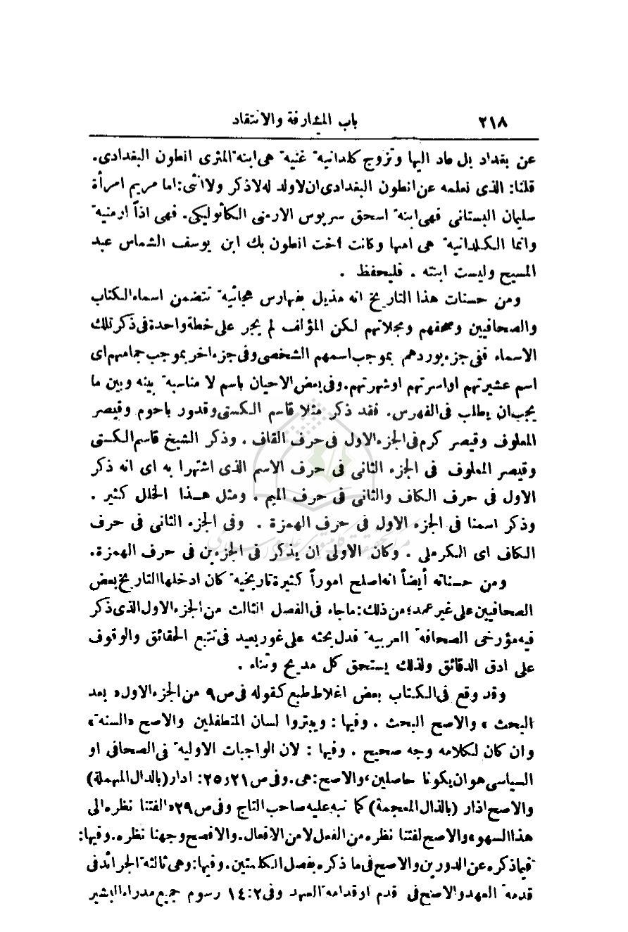 وقد وقع في الكتاب بعض أغلاط طبع كقوله في ص 9 من الجزء الأول (بعد البحث) والأصح البحث. وفيها: ويبتروا لسان المتطفلين والأصح (السنة) وإن كان لكلامه وجه صحيح. وفيه: لأن الواجبات الأولية في الصحافي أو السياسي هو أن يكونا حاصلين، والأصح: هي. وفي ص 21 و25: أدار (بالدال المهملة) والأصح آذار (بالذال المعجمة) كما نبه عليه صاحب التاج وفي ص 29 (ألفتنا نظرة إلى هذا السهو) والأصح لفتنا نظره من الفعل لا من الأفعال. والأفصح وجهنا نظره. وفيه: فيما ذكره عن الدورين والأصح في ما ذكره بفصل الكلمتين. وفيها: وهي ثالثة الجرائد في قدمة العهد والأصح في قدم أو قدامة العهد وفي 2: 14 رسوم جميع مدراء البشير