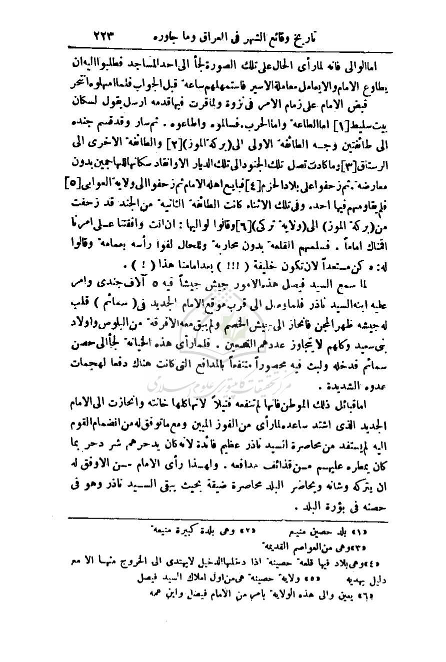 أما قبائل ذلك الموطن فإنها لم تنفعه فتيلاً لأنها كلها خانته وانحازت إلى الإمام الجديد الذي اشتد ساعده لما رأى من الفوز المبين ومع ما توفق له من انضمام القوم إليه لم يستفد من محاصرة السيد ناذر عظيم فائدة لأنه كان يدحرهم شر دحر بما كان يمطره عليهم من قذائف مدافعه. ولهذا رأى الإمام من الأوفق له أن يتركه وشأنه ويحاصر البلد محاصرة ضيقة بحيث يبقى السيد ناذر وهو في حصنه في بؤرة البلد.