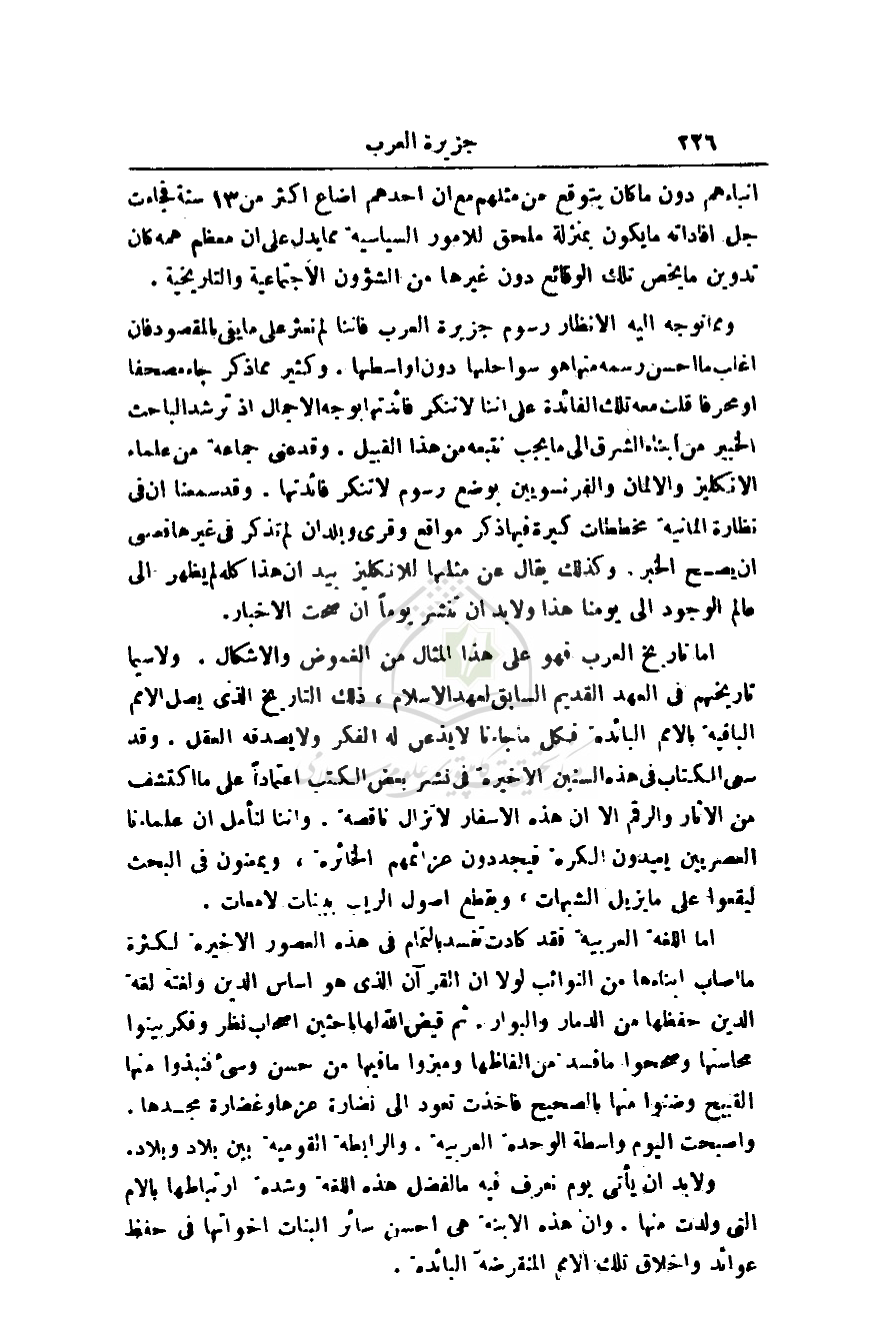 أما تاريخ العرب فهو على هذا المثال من الغموض والإشكال. ولا سيما تاريخهم في العهد القديم السابق لعهد الإسلام، ذلك التاريخ الذي يصل الأمم الباقية بالأمم البائدة فكل ما جاءنا لا يذعر له الفكر ولا يصدقه العقل. وقد سعى الكتاب في هذه السنين الأخيرة في نشر بعض الكتب اعتماداً على ما اكتشف من الآثار والرقم إلا أن هذه الأسفار لا تزال ناقصة. وإننا لنأمل إن علماءنا العصريين يعيدون الكرة فيجددون عزائمهم الخائرة، ويمعنون في البحث ليقعوا على ما يزيل الشبهات، ويقطع أصول الريب ببينات لامعات.
