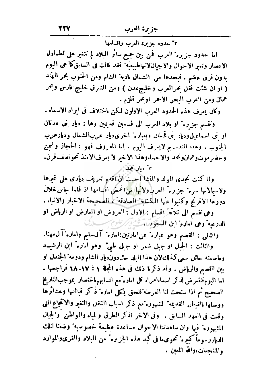 أما حدود جزيرة العرب فمن بين جميع سائر البلاد لم تتغير على تطاول الاعصار وتغير الأحوال والأجيال لأنها طبيعية فقد كانت في السابق كما هي اليوم بدون فرق عظيم. فيحدها من الشمال بادية الشام ومن الجنوب بحر الهند (أو إن شئت فقل بحر العرب وخليج عدن) ومن الشرق خليج فارس وبحر عمان ومن الغرب البحر الأحمر أو بحر قلزم.
