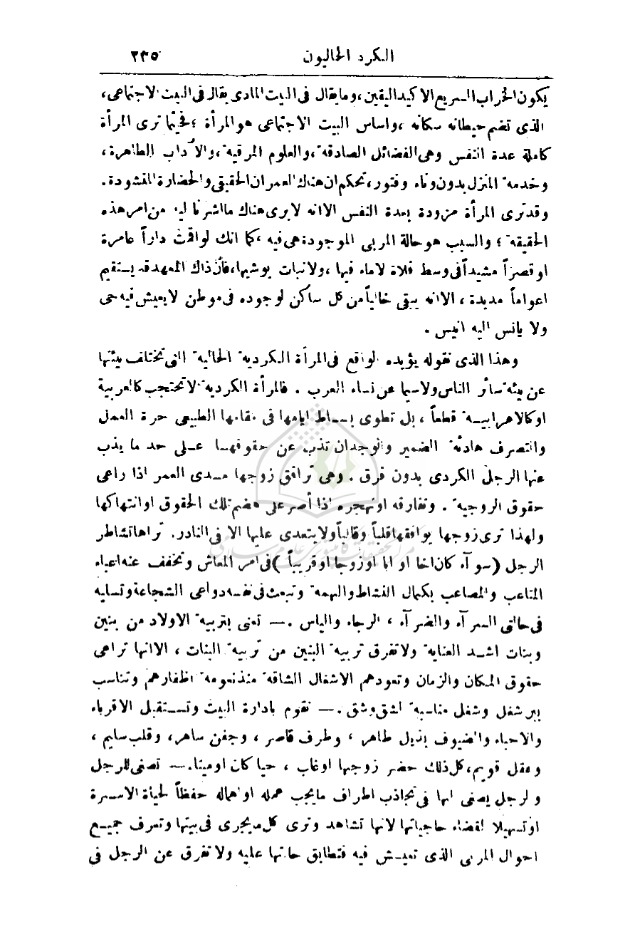 يكون الخراب السريع الأكيد اليقين، وما يقال في البيت المادي يقال في البيت الاجتماعي، الذي تضم حيطانه سكانه، وأساس البيت الاجتماعي هو المرأة؛ فحيثما ترى المرأة كاملة عدة النفس وهي الفضائل الصادقة، والعلوم المرقية، والآداب الطاهرة، وخدمة المنزل بدون وناء وفتور، تحكم إن هناك العمران الحقيقي والحضارة المنشودة. وقد ترى المرأة مزودة بعدة النفس إلا أنه لا يرى هناك ما أشرنا إليه من أمر هذه الحقيقة؛ والسبب هو حالة المربي الموجودة هي فيه، كما أنك لو أقمت داراً عامرة أو قصراً مشيداً في وسط فلاة لا ماء فيها، ولا نبات يوشيها، فإن ذلك المعهد قد يستقيم أعواماً مديدة، إلا أنه يبقى خالياً من كل ساكن لوجوده في موطن لا يعيش فيه حي ولا يأنس فيه أنيس.