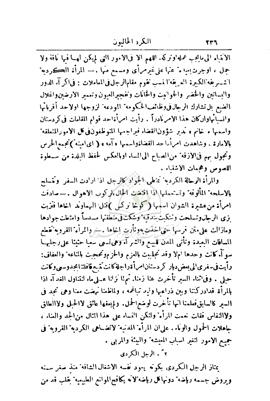 وسعي وكانت حبلى. وفي أثناء السير تأخرت عنا زمناً. ثم لما نزلنا على ماء لنتناول الغذاء إذا بالمرأة قد أدركتنا وبين ذراعيها وليد تباغمه، ولما ظعنا نهضت معنا وهي تجد في السير كالسابق فعلمنا أنها تأخرت لوضع الحمل. ولم يعقها عائق لا الحبل ولا الطلق ولا النفاس فقلت نعمت المرأة ولتكن النساء على هذا المثال من الجد والعناء، جاهلات الحمول والوناء. على أن المرأة المدنية لا تضاهي الكردية القروية في جميع الأمور لتغير أسباب المعيشة والبيئة والمربى.