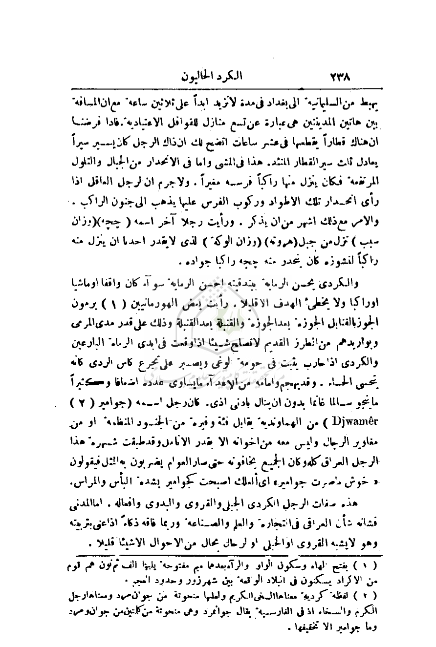 يهبط من السليمانية إلى بغداد في مدة لا تزيد أبداً على ثلاثين ساعة مع أن المسافة بين هاتين المدينتين هي عبارة عن تسع منازل للقوافل الاعتيادية. فإذا فرضنا إن هناك قطاراً يقطعها في عشر ساعات اتضح لك إن ذاك الرجل كان يسير سيراً يعادل ثلث سير القطار المتئد. هذا في المشي وأما في الانحدار من الجبال والتلول المرتفعة فكان ينزل منها راكباً فرسه مغيراً. ولا جرم أن الرجل العاقل إذا رأى انحدار تلك الاطواد وركوب الفرس عليها يذهب إلى جنون الراكب. والأمر مع ذلك أشهر من أن يذكر. ورأيت رجلاً اسمه (ججه) (وزان سبب) نزل من جبل (هروته) (وزان الوكة) الذي لا يقدر أحدنا أن ينزل منه راكباً لنشوزه كان ينحدر منه ججه راكباً جواده.
