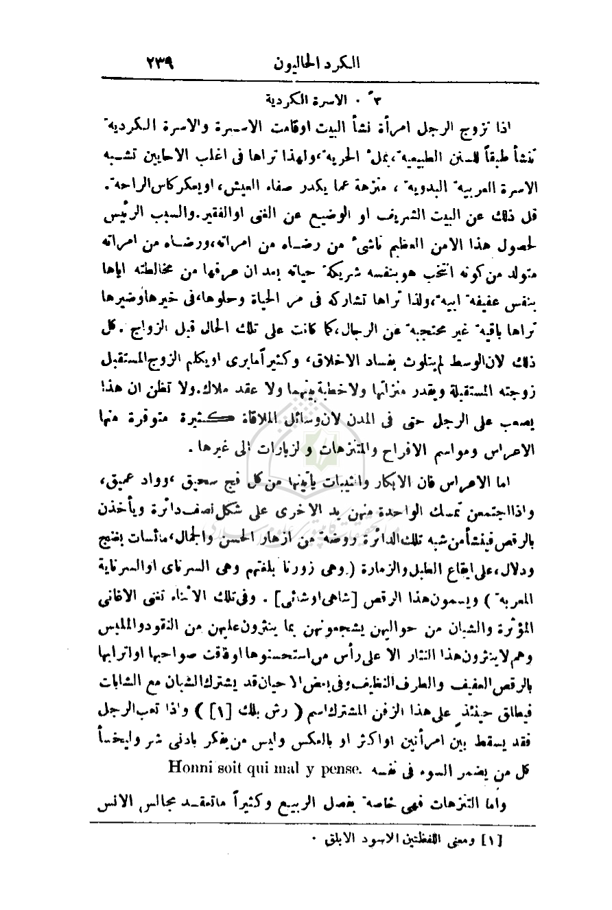 إذا تزوج الرجل امرأة نشأ البيت أو قامت الأسرة والأسرة الكردية تنشأ طبقاً للسنن الطبيعية، بملء الحرية، ولهذا تراها في اغلب الأحايين تشبه الأسرة العربية البدوية، منزهة عما يكدر صفاء العيش، أو يعكر كأس الراحة. قل ذلك عن البيت الشريف أو الوضيع عن الغني أو الفقير. والسبب الرئيس لحصول هذا الأمن العظيم ناشئ من رضاه من امرأته، ورضاه من امرأته متولد من كونه انتخب هو بنفسه شريكة حياته بعد أن عرفها من مخالطته إياها بنفس عفيفة أبية، ولذا تراها تشاركه في مر الحياة وحلوها، في خيرها وضيرها تراها باقية غير محتجبة عن الرجال، كما كانت على تلك الحال قبل الزواج. كل ذلك لأن الوسط لم يلوث بفساد الأخلاق، وكثيراً ما يرى أو يكلم الزوج المستقبل زوجته المستقبلة وقدر منزلتها ولا خطبة بينهما ولا عقد ملاك. ولا تظن أن هذا يصعب على الرجل حتى في المدن لأن وسائل الملاقاة كثيرة متوفرة منها الأعراس ومواسم الأفراح والمتنزهات والزيارات إلى غيرها.