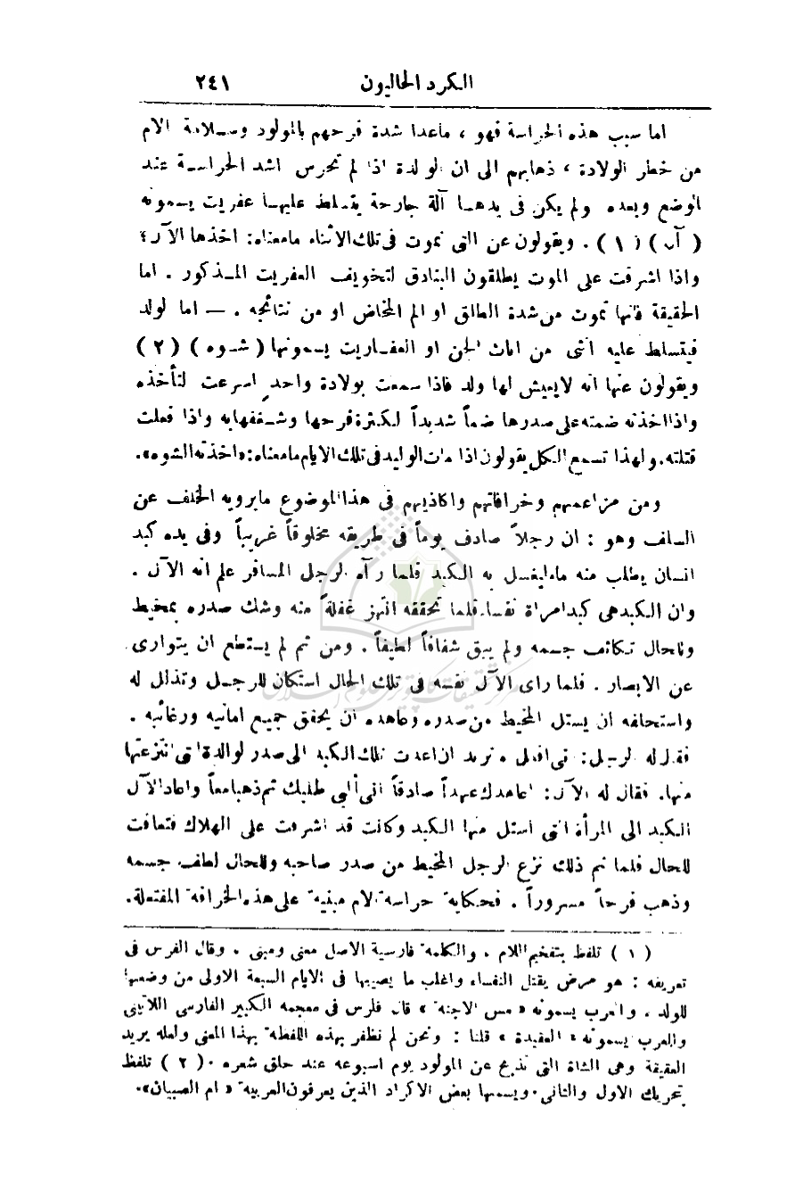 أما سبب هذه الحراسة فهو، ما عدا شدة فرحهم بالمولود وسلامة الأم من خطر الولادة، ذهابهم إلى أن الوالدة إذا لم تحرس أشد الحراسة عند الوضع وبعده ولم يكن في يدها آلة جارحة يتسلط عليها عفريت يسمونه (آل). ويقولون عن التي تموت في تلك الأثناء ما معناه: أخذها الأل؛ وإذا أشرفت على الموت يطلقون البنادق لتخويف العفريت المذكور. أما الحقيقة فإنها تموت من شدة الطلق أو ألم المخاض أو من نتائجه. - أما الولد فيتسلط عليه أنثى من إناث الجن أو العفاريت يسمونها (شوه) ويقولون عنها إنه لا يعيش لها ولد فإذا سمعت بولادة واحدٍ أسرعت لتأخذه وإذا أخذته ضمته على صدرها ضماَ شديداً لكثرة فرحها وشغفها به وإذا فعلت قتلته. ولهذا تسمع الكل يقولون إذا مات الوليد في تلك الأيام ما معناه: (أخذته الشوه).