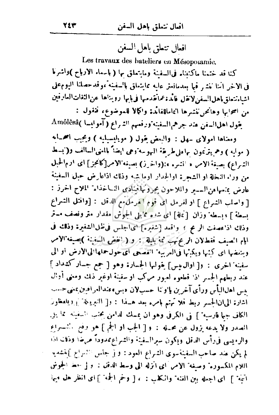 ومعناها امولاي سهل: والبعض يقول (مويليسليه) ويجيب أصحابه (موليه) وهم يترنمون بها على طريقة الهوسة وهي أيضاً بالمعنى السالف و (ابسط الشراع) بصيغة الأمر (أنشره): (وأخرز) بصيغة الأمر (كأنجز) أي أرم الحبل من وراء النخلة أو الشجرة أو الجدار أو ما شابه وذلك إذا عارض حبل السفينة عارض يمنعها من السير والملاحون يجرونها فينادي الناخذاة الملاح اخرز: (وأصلب الشراع) أو الفرمل أي قوم الفرمل مع الدقل: (وأقتل الشراع بسطة) وبسطة وزان (نملة) أي شده مما يلي الجوش مقدار متر ونصف متر وذلك إذا عصفت الريح؛ وأقعد (شفيره) أي أجلس في ظل الشفيرة وذلك في أيام الصيف فقط لأن الريح تهب ثمة بليلة: و (أنفض السفينة) بصيغة الأمر وينفضها أي كبثها ويكبثها في العربية الفصحى أي حول حملها إلى الأرض أو إلى سفينة أخرى: و (أوال بيس) يقولها الجسارة وهو (جمع جسار كشداد) عند ربطهم الجسر إذا قطعوه لعبور مركب أو سفينة أو غير ذلك ومعنى أوال بيس أهل البأس ورأى آخرين يا ولنا حسب لأن (بس) عند العراقيين بمعنى حسب إشارة إلى إن الجسر ربط فلا تهتم بأمره بعد هذا و (التبريكة) ويلفظون الكاف جيماً فارسية) في الكرفي وهو أن يمسك الدامن بجنب السفينة مما يلي الصدر ولا يدعه يزول عن محله: و (الجب أو الجم) هو رفع الشراع والرء يسي في رأس الدقل ويكون سير السفينة والشراع ممدوداً عرضاً وذلك إذا لم يكن عند صاحب السفينة سوى الشراع العود: و (جلس الشراع) بتشديد اللام المكسورة وصيغة الأمر أي أنزله إلى وسط الدقل: و (حط الجوش اتيمة) أي جعله بين الفنة والكلب:، (وخم الجمة) أي أنظر هل فيها