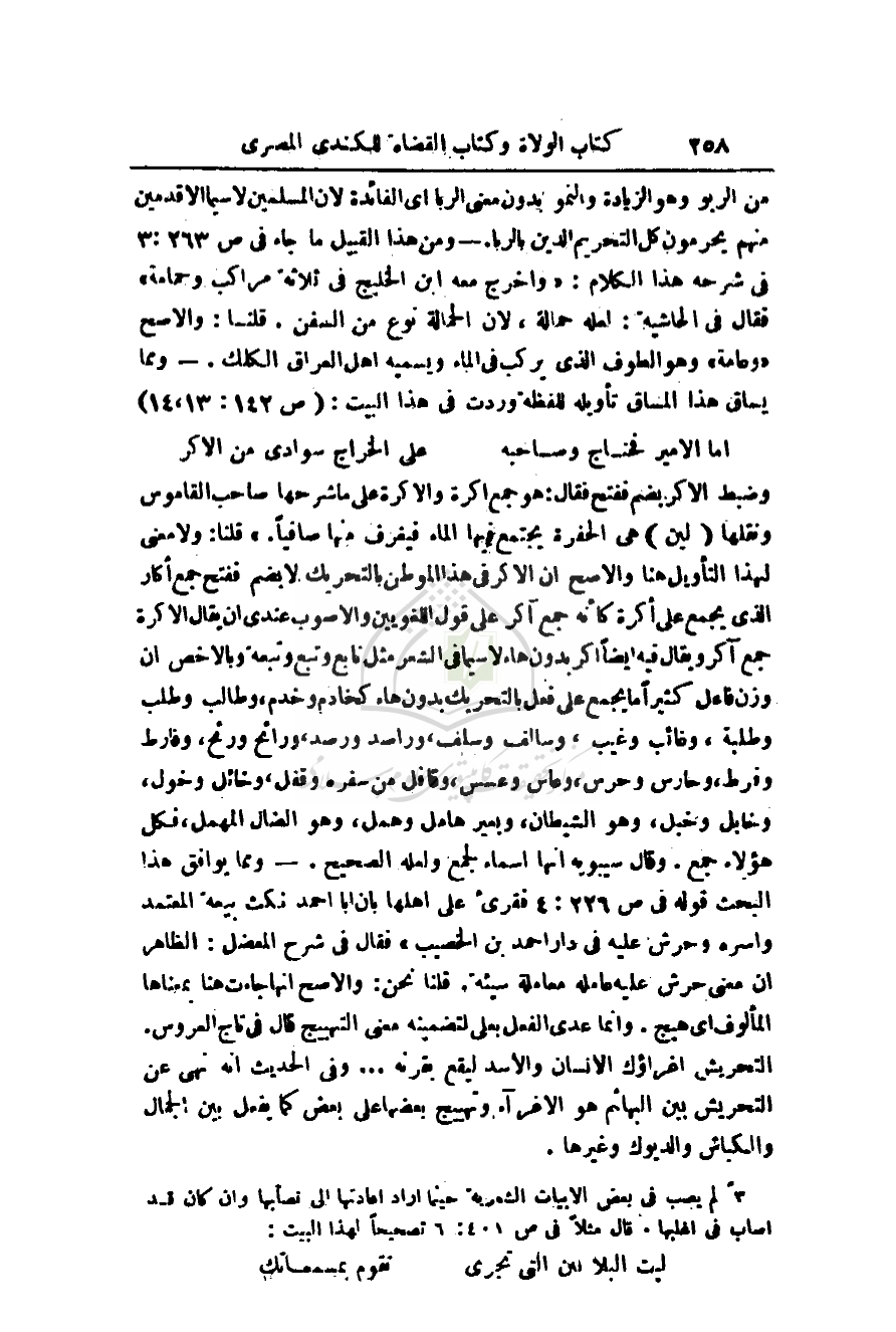 من الربو وهو الزيادة والنمو بدون معنى الربا أي الفائدة لأن المسلمين لا سيما الأقدمين منهم يحرمون كل التحريم الدين بالرباء. - ومن هذا القبيل ما جاء في ص 263: 3 في شرحه هذا الكلام: (واخرج معه ابن الخليج في ثلاثة مراكب وحمامة) فقال في الحاشية: لعله حمالة، لأن الحمالة نوع من السفن. قلنا: والأصح (وعامة) وهو الطوف الذي يركب في الماء ويسميه أهل العراق الكلك. - ومما يساق هذا المساق تأويله للفظة وردت في هذا البيت: (ص 142: 13، 14)
