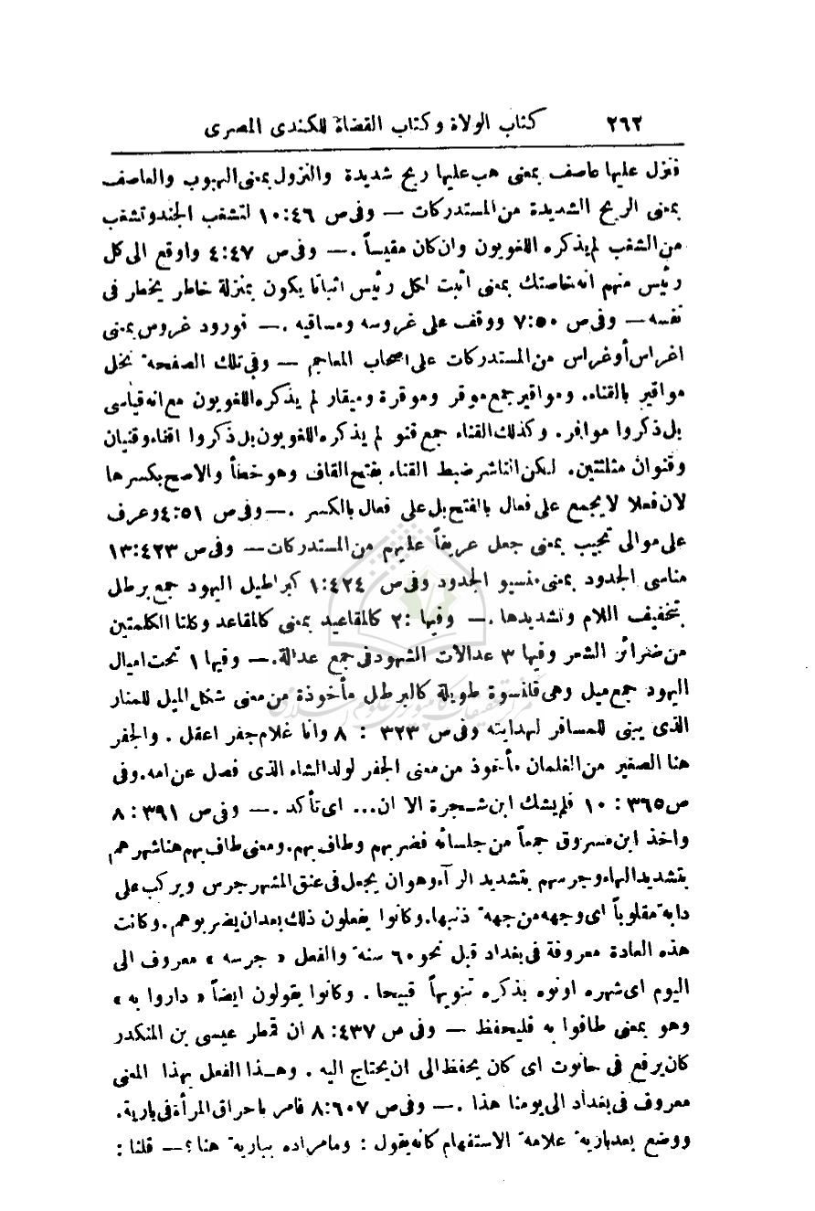 فنزل عليها عاصف بمعنى هب عليها ريح شديدة والنزول بمعنى الهبوب والعاصف بمعنى الريح الشديدة من المستدركات - وفي ص 46: 10 لتشغب الجند وتشغب من الشغب لم يذكره اللغويون وإن كان مقيساً. - وفي ص 47: 4 وأوقع إلى كل رئيس منهم إنه خاصتك بمعنى أثبت لكل رئيس إثباتاً يكون بمنزلة خاطر يخطر في نفسه - وفي ص 50: 7 ووقف على غروسه ومساقيه. - فورود غروس بمعنى اغراس أو غراس من المستدركات على أصحاب المعاجم - وفي تلك الصفحة نخل مواقير بالقناء. ومواقير جمع موقر وموقرة وميقار لم يذكره اللغويون مع إنه قياسي بل ذكروا مواقر. وكذلك القناء جمع قنو لم يذكره اللغويون بل ذكروا اقناء وقنيان وقنوان مثلثتين. لكن الناشر ضبط القناء بفتح القاف وهو خطأ والأصح بكسرها لأن فعلا لا يجمع على فعال بالفتح بل على فعال بالكسر. - وفي ص 51: 4 وعرف على موالي تجيب بمعنى جعل عريفاً عليهم من المستدركات - وفي ص 423: 13 مناسي الجدود بمعنى منسيو الجدود وفي ص 424: 1 كبراطيل اليهود جمع براطل بتخفيف اللام وتشديدها. - وفيها: 2 كالمقاعيد بمعنى كالمقاعد وكلتا الكلمتين من ضرائر الشعر وفيها 3 عدالات الشهود في جمع عدالة. - وفيها 1 تحت أميال اليهود جمع ميل وهي قلنسوة طويلة كالبرطل مأخوذة من معنى شكل الميل للمنار الذي يبنى للمسافر لهدايته وفي ص 323: 8 وأنا غلام جفر اعقل. والجفر هنا الصغير من الغلمان مأخوذ من معنى الجفر لولد الشاء الذي فصل عن أمه. وفي ص 365: 10 فلم يشك ابن شجرة إلا أن. . . أي تأكد. - وفي ص 391: 8 وأخذ ابن مسروق جمعاً من جلسائه فضربهم وطاف بهم. ومعنى طاف بهم هنا شهرهم بتشديد الهاء وجرسهم بتشديد الراء وهو إن يجعل في عنق المشهر جرس ويركب على دابة مقلوباً أي وجهه من جهة ذنبها. وكانوا يفعلون ذلك بعد أن يضربوهم. وكانت هذه العادة معروفة في بغداد قبل نحو 60 سنة والفعل (جرسه) معروف إلى اليوم أي شهره أو نوه بذكره تنويهاً قبيحاً. وكانوا يقولون أيضاً (داروا به) وهو بمعنى طافوا به فليحفظ - وفي ص 437: 8 إن قمطر عيسى بن المنكدر كان يرفع في حانوت أي كان يحفظ إلى أن يحتاج إليه. وهذا الفعل بهذا المعنى معروف في بغداد إلى يومنا هذا. - وفي ص 607: 8 فأمر بإحراق المرأة في بارية. ووضع بعد بارية علامة الاستفهام كأنه يقول: وما مراده ببارية هنا؟ - قلنا: