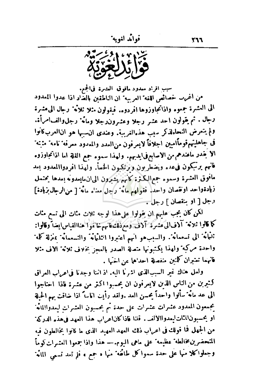 من أغرب خصائص اللغة العربية أن الناطقين بالضاد إذا عدوا المعدود إلى العشرة جمعوه وإذا تجاوزوها أفردوه. فيقولون مثلاً ثلاثة رجال إلى عشرة رجال. ثم يقولون أحد عشر رجلاً وعشرون رجلاً ومائة رجل وألف امرأة. ولم يعترض النحاة لذكر سبب هذه الغريبة. وعندي إن سببها هو أن العرب كانوا في جاهليتهم قوماً أميين أجلافاً لا يعرفون من العدد والمعدود معرفة تامة مثبتة إلا بقدر ما عندهم من الأصابع في أيديهم، ولهذا سموه جمع القلة أما إذا تجاوزوه فإنهم يرتكبون في عده ويضطربون ويرتكبون الخطأ. لهذا أفردوا المعدود بعد ما فوق العشرة وسموه جمع الكثرة كأنهم يشيرون إلى أن ما يعدونه بعدها يحتمل زيادة واحد أو نقصان واحد. فقولهم مائة رجل معناه مائة (من رجال بزيادة) رجل (أو بنقصان) رجل.