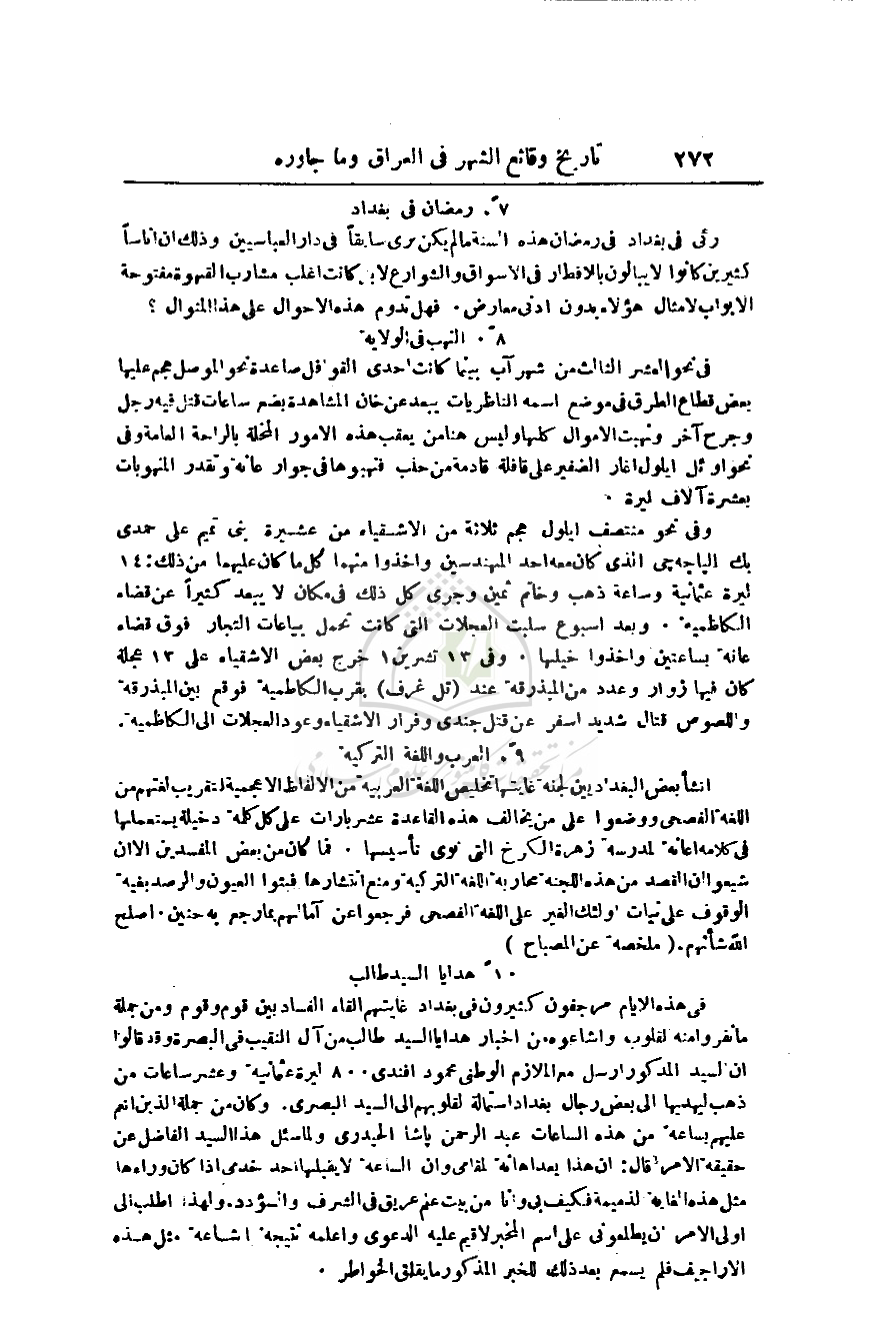 رئى في بغداد في رمضان هذه السنة ما لم يكن يرى سابقاً في دار العباسيين وذلك أن أناساً كثيرين كانوا لا يبالون بالإفطار في الأسواق والشوارع لا بل كانت اغلب مشارب القهوة مفتوحة الأبواب لأمثال هؤلاء بدون أدنى معارض. فهل تدوم هذه الأحوال على هذا المنوال؟