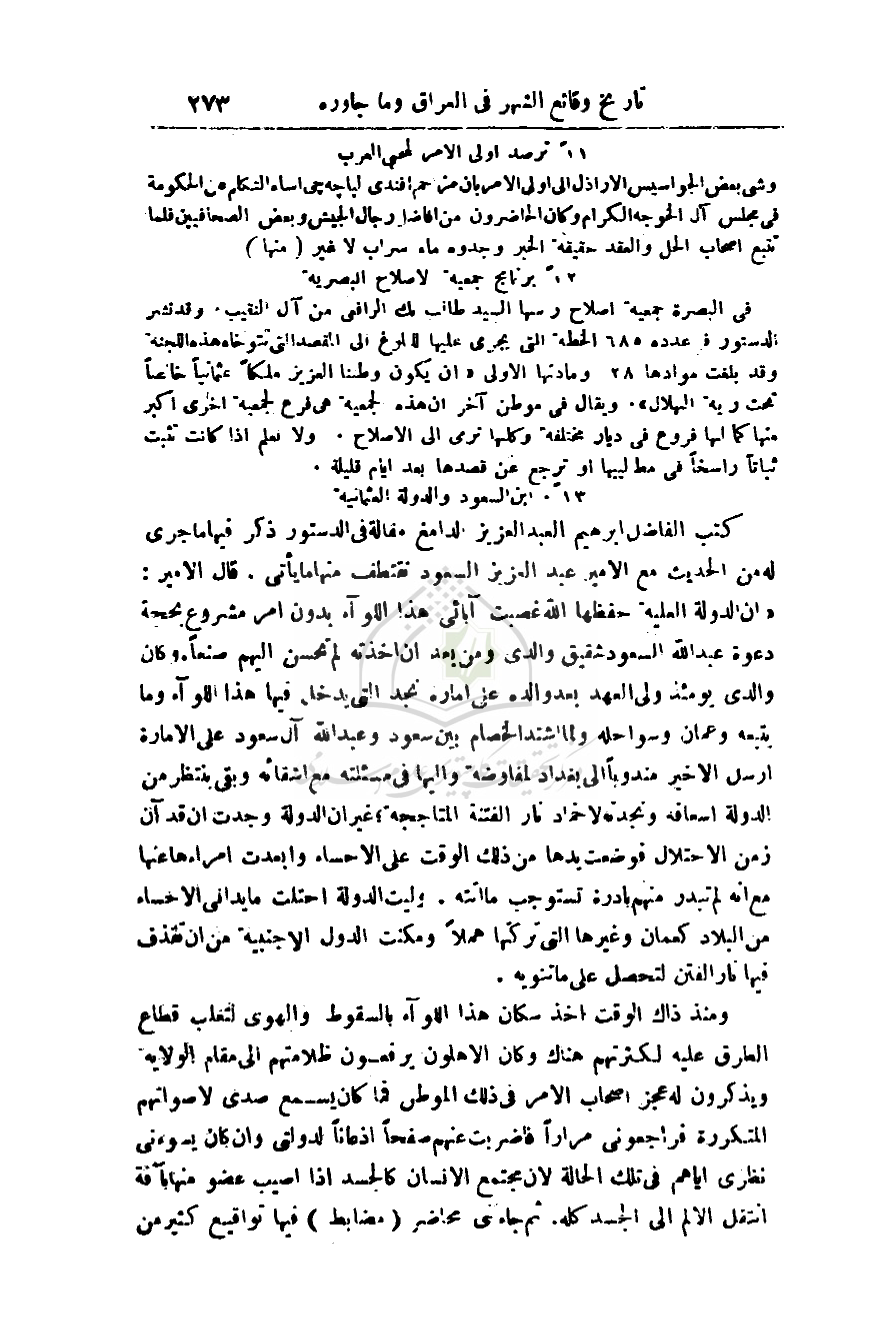كتب الفاضل إبراهيم العبد العزيز الدامغ مقالة في الدستور ذكر فيها ما جرى له من الحديث مع الأمير عبد العزيز السعود نقتطف منها ما يأتي. قال الأمير: (إن الدولة العلية حفظها الله غصبت آبائي هذا اللواء بدون أمر مشروع بحجة دعوة عبد الله السعود شقيق والدي ومن بعد أن أخذته لم تحسن إليهم صنعاً. وكان والدي يومئذ ولي العهد بعد والده على إمارة نجد التي يدخل فيها هذا اللواء وما يتبعه وعمان وسواحله ولما أشتد الخصام بين سعود وعبد الله آل السعود على الإمارة أرسل الأخير مندوباً إلى بغداد لمفاوضة واليها في مسألته مع أشقائه وبقي ينتظر من الدولة إسعافه ونجدته لإخماد نار الفتنة المتأججة؛ غير أن الدولة وجدت أن قد آن زمن الاحتلال فوضعت يدها من ذلك الوقت على الاحساء وأبعدت أمراءها عنها مع أنه لم تبدر منهم بادرة تستوجب ما أتته. وليت الدولة احتلت ما يداني الاحساء من البلاد كعمان وغيرها التي تركتها هملاً ومكنت الدول الأجنبية من أن تقذف فيها نار الفتن لتحصل على ما تنويه.