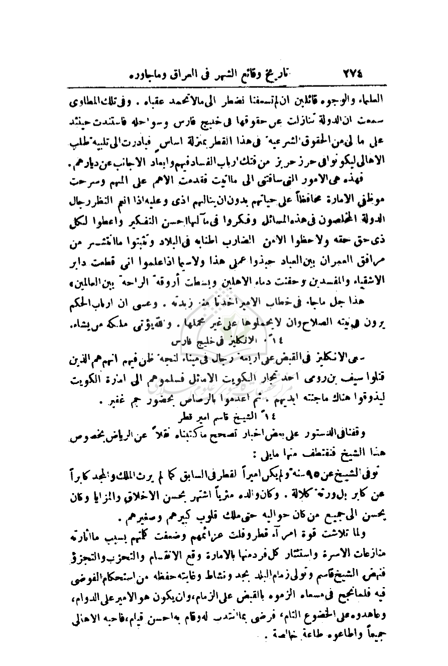 العلماء والوجوه القائلين أن لم تسعفنا نضطر إلى ما لا تحمد عقباه. وفي تلك المطاوي سمعت أن الدولة تنازلت عن حقوقها في خليج فارس وسواحله فاستندت حينئذ على ما لي من الحقوق الشرعية في هذا القطر بمنزلة أساس فبادرت إلى تلبية طلب الأهالي ليكونوا حرز حريز من فتك أرباب الفساد فيهم وإبعاد الأجانب عن ديارهم.
