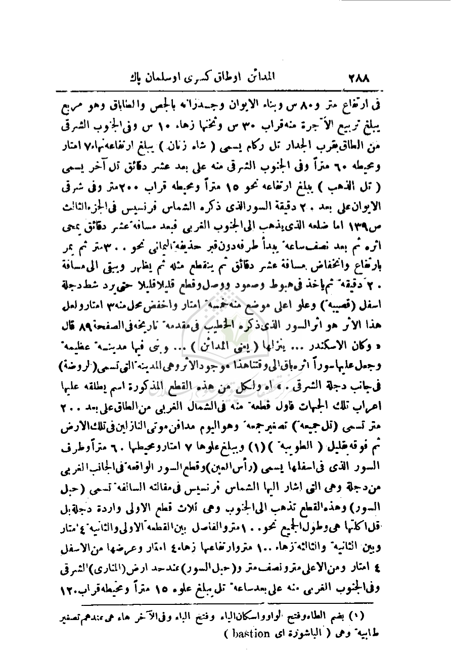 في ارتفاع متر و80 س وبناء الإيوان وجدرانه بالجص والطاباق وهو مربع يبلغ تربيع الآجرة منه قراب 30 س وثخنها زهاء 10 س وفي الجنوب الشرقي من الطاق بقرب الجدار تل ركام يسمى (شاه زنان) يبلغ ارتفاعه زهاء 7 أمتار ومحيطه 60 متراً وفي الجنوب الشرقي منه على بعد عشر دقائق تل آخر يسمى (تل الذهب) يبلغ ارتفاعه نحو 15 متراً ومحيطه قراب 200 متر وفي شرقي الإيوان على بعد 20 دقيقة السور الذي ذكره الشماس فرنسيس في الجزء الثالث ص 139 أما ضلعه الذي يذهب إلى الجنوب الغربي فبعد مسافة عشر دقائق يمحي أثره ثم بعد نصف ساعة يبدأ طرفه دون قبر حذيفة اليماني نحو 300 متر ثم يمر بارتفاع وانخفاض مسافة عشر دقائق ثم ينقطع مثله ثم يظهر ويبقى إلى مسافة 20 دقيقة ثم يأخذ في هبوط وصعود ووصل وقطع قليلاً قليلاً حتى يرد شط دجلة أسفل (قصيبة) وعلو أعلى موضع منه خمسة أمتار واخفض محل منه 3 أمتار ولعل هذا الأثر هو أثر السور الذي ذكره الخطيب في مقدمة تاريخه في الصفحة 89 قال (وكان الإسكندر. . . ينزلها (يعني المدائن). . . وبنى فيها مدينة عظيمة وجعل عليها سوراً أثره باق إلى وقتنا هذا موجود الأثر وهي المدينة التي تسمى (الروضة) في جانب دجلة الشرقي.) أهـ ولكل من هذه القطع المذكورة اسم يطلقه عليها أعراب تلك الجهات فأول قطعة منه في الشمال الغربي من الطاق على بعد 200 متر تسمى (تل جميعة) تصغير جمعة وهو اليوم مدافن موتى النازلين في تلك الأرض ثم فوقه بقليل (الطويبة) ويبلغ علوها 7 أمتار ومحيطها 60 متراً وطرف السور الذي في أسفلها يسمى (رأس العين) وقطع السور الواقعة في الجانب الغربي من دجلة وهي التي أشار إليها الشماس