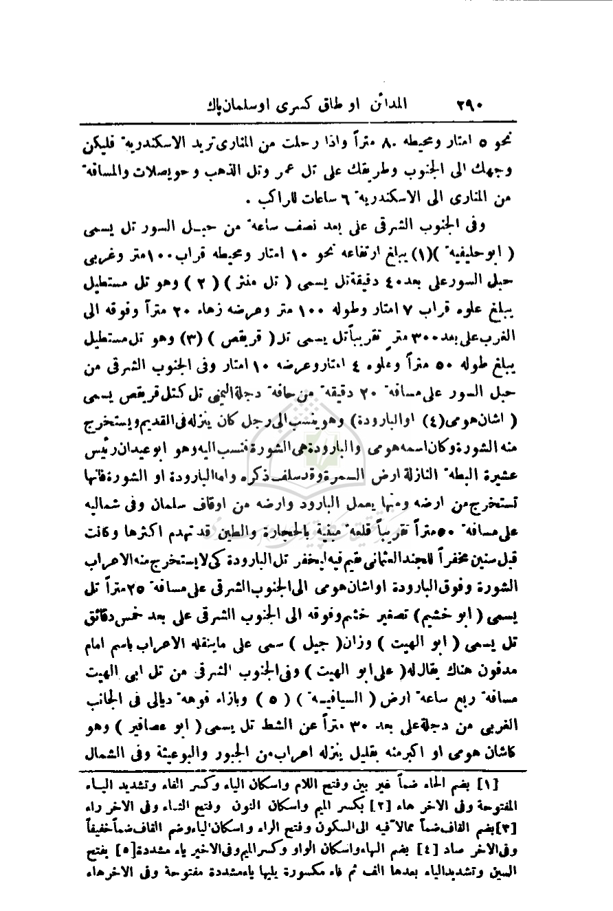 تل يسمى (تل منثر) وهو تل مستطيل يبلغ علوه قراب 7 أمتار وطوله 100 متر وعرضه زهاء 20 متراً وفوقه إلى الغرب على بعد 300 متر تقريباً تل يسمى تل (قريقص) وهو تل مستطيل يبلغ طوله 50 متراً وعلوه 4 أمتار وعرضه 10 أمتار وفي الجنوب الشرقي من حبل السور على مسافة 20 دقيقة من حافة دجلة اليمنى تل كتل قريقص يسمى (اشان هومي أو البارودة) وهو ينسب إلى رجل كان ينزله في القديم ويستخرج منه الشورة وكان اسمه هومي والبارودة هي الشورة فنسب إليه وهو أبو عيدان رئيس عشيرة البطة النازلة أرض السمرة وقد سلف ذكره وأما البارودة أو الشورة فإنها تستخرج من أرضه ومنها يعمل البارود وأرضه من أوقاف سلمان وفي شماليه على مسافة 50 متراً تقريباً قلعة مبنية بالحجارة والطين قد تهدم أكثرها وكانت قبل سنين مخفراً للجند العثماني يقيم فيه ليخفر تل البارودة كي لا يستخرج منه الأعراب الشورة وفوق البارودة أو اشان هومي إلى الجنوب الشرقي على مسافة 25 متراً تل يسمى (أبو خشيم) تصغير خشم وفوقه إلى الجنوب الشرقي على بعد خمس دقائق تل يسمى (أبو الهيت) وزان (جيل) سمى على ما ينقله الأعراب باسم إمام مدفون هناك يقال له (علي أبو الهيت) وفي الجنوب الشرقي من تل أبي هيت مسافة ربع ساعة أرض (السيافية) وبازاء فوهة ديالى في الجانب الغربي من دجلة على بعد 30 متراً عن الشط تل يسمى (أبو عصافير) وهو كاشان هومي أو أكبر منه بقليل ينزله أعراب من الجبور والبو عيثة وفي الشمال