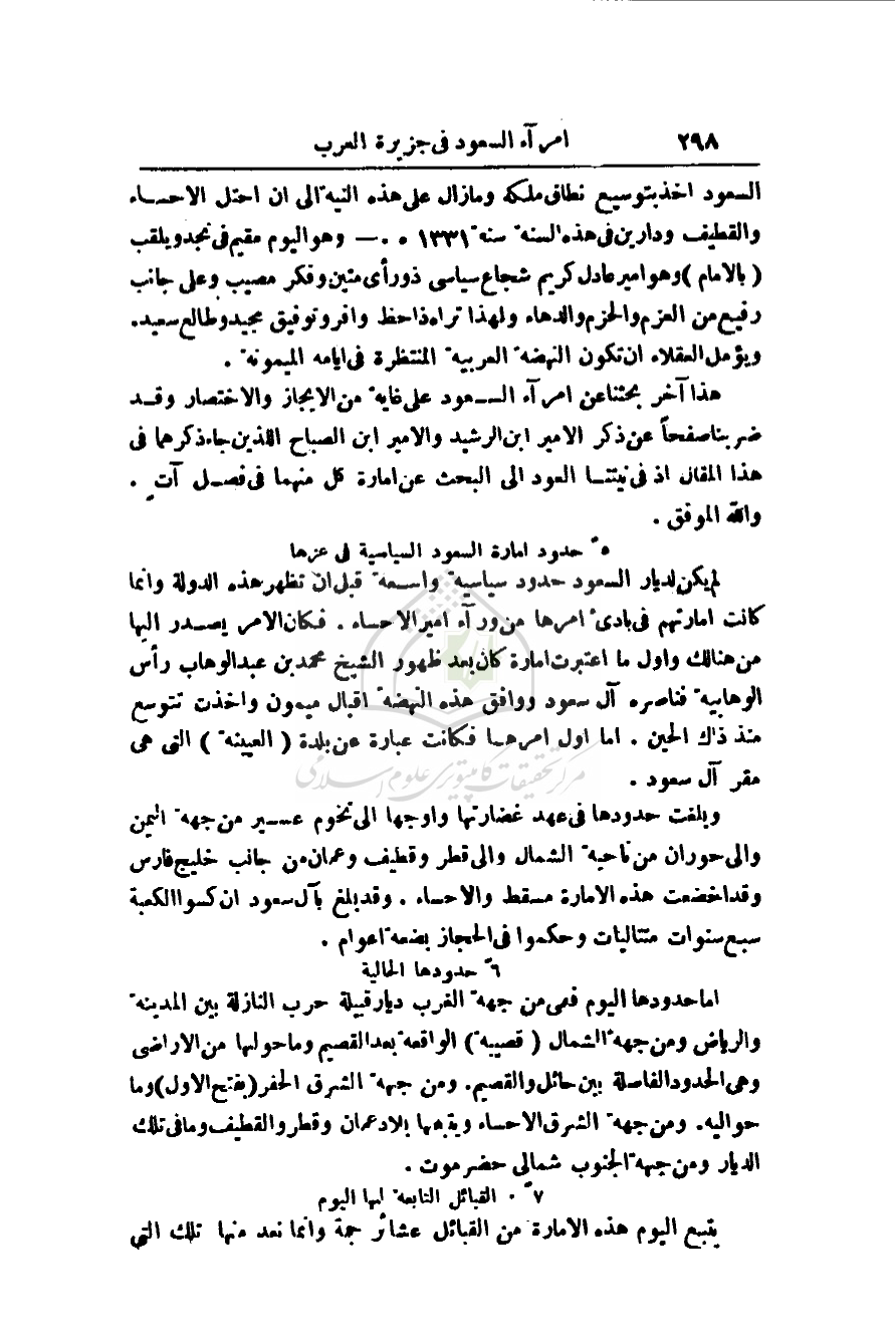 السعود أخذ بتوسيع نطاق ملكه وما زال على هذه النية إلى أن احتل الاحساء والقطيف ودارين في هذه السنة سنة 1331هـ - وهو اليوم مقيم في نجد ويلقب (بالإمام) وهو أمير عادل كريم شجاع سياسي ذو رأي متين