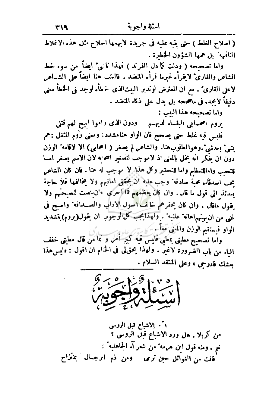 وأما تصحيحه (ودلت كما دل الفرند) فهذا ناشئ أيضاً من سوء خط الشاعر والقارئ لا يقرأه غير ما قرأه المنضد. فالعتب هنا أيضاً على الشاعر لا على القارئ. مع أن المعترض لو تدبر البيت الذي خطأه لوجد في الخطأ معنى دقيقاً لا يجده في ما صححه بل يدل على ذكاء المنضد.