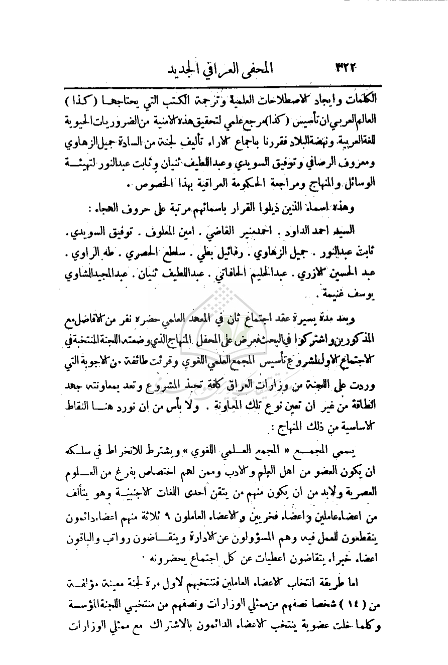 الكلمات وإيجاد الاصطلاحات العلمية وترجمة الكتب التي يحتاجها (كذا) العالم العربي أن تأسيس (كذا) مرجع علمي لتحقيق هذه الأمنية من الضروريات الحيوية للغة العربية ونهضة البلاد فقررنا بإجماع الآراء تأليف لجنة من السادة جميل الزهاوي ومعروف الرصافي وتوفيق