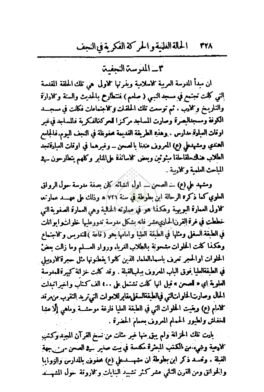 إن مبدأ المدرسة العربية الإسلامية وبذرتها الأولى هي تلك الحلقة المقدسة التي كانت تجتمع في مسجد النبي - صلى الله عليه وسلم - فتتطارح بالحديث والسنة والإدارة والتاريخ والأدب، ثم توسعت تلك الحلقات والاجتماعات فكانت في مسجد الكوفة ومسجد البصرة وصارت المساجد مركزا للحركة الفكرية فالمساجد في غير أوقات العبادة مدارس. وهذه الطريقة القديمة محفوظة في النجف اليوم، فالجامع الهندي ومشهد علي (ع) المعروف عندنا بالصحن - وغيرهما في أوقات العبادة تجد الطلاب هناك حلقا حلقا مبثوثين وبعض الأساتذة على المنابر وكلهم يتطارحون في المباحث العلمية والأدبية.