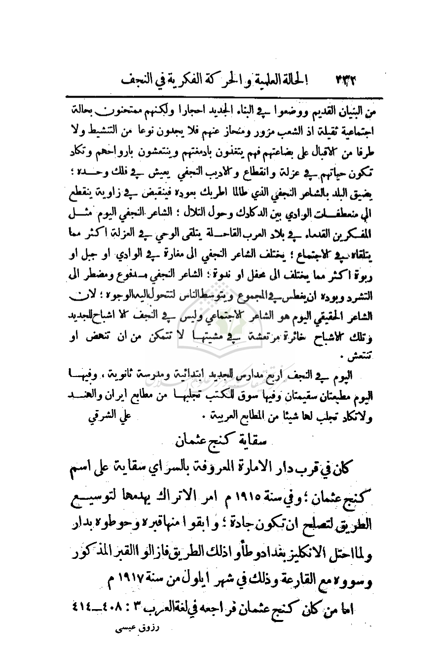 اليوم في النجف أربع مدارس للجديد ابتدائية ومدرسة ثانوية، وفيها اليوم مطبعتان سقيمتان وفيها سوق للكتب تجلبها من مطابع إيران والهند ولا تكاد تجلب لها شيئا من المطابع العربية.