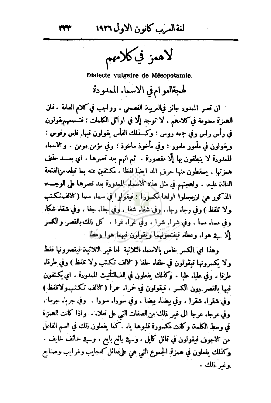إن قصر الممدود جائز في العربية الفصحى، وواجب في كلام العامة. فإن الهمزة معدومة في كلامهم، لا توجد إلاَّ في أوائل الكلمات؛ فتسمعهم يقولون في رأس راس وفي جمعه روس؛ وكذلك الفأس يقولون فيها فاس وفوس؛ ويقولون في مأمور مامور؛ وفي مأخوذ ماخوذ: وفي مؤمن مومن. والأسماء الممدودة لا ينطقون بها إلاَّ مقصورة. ثم أنهم بعد قصرها، أي بعد حذف همزتها، يسقطون منها حرف المد أيضا لفظا، مكتفين عنه بما قبله من الفتحة الدالة عليه. ولهجتهم في مثل هذه الأسماء الممدودة بعد قصرها على الوجه المذكور هي أن يجعلوا أولها مكسورا؛ فيقولوا في سماء سما (الألف تكتب ولا تلفظ) وفي رجاء رجا، وفي شفاء شفا، وفي جفاء جفا، وفي شقاء شكا، وفي مساء مسا، وفي شراء شرا، وفي غراء غرا. كل ذلك بالقصر والكسر إلاَّ في هواء وعطاء فيفتحونهما ويقولون فيهما هوا وعطا.