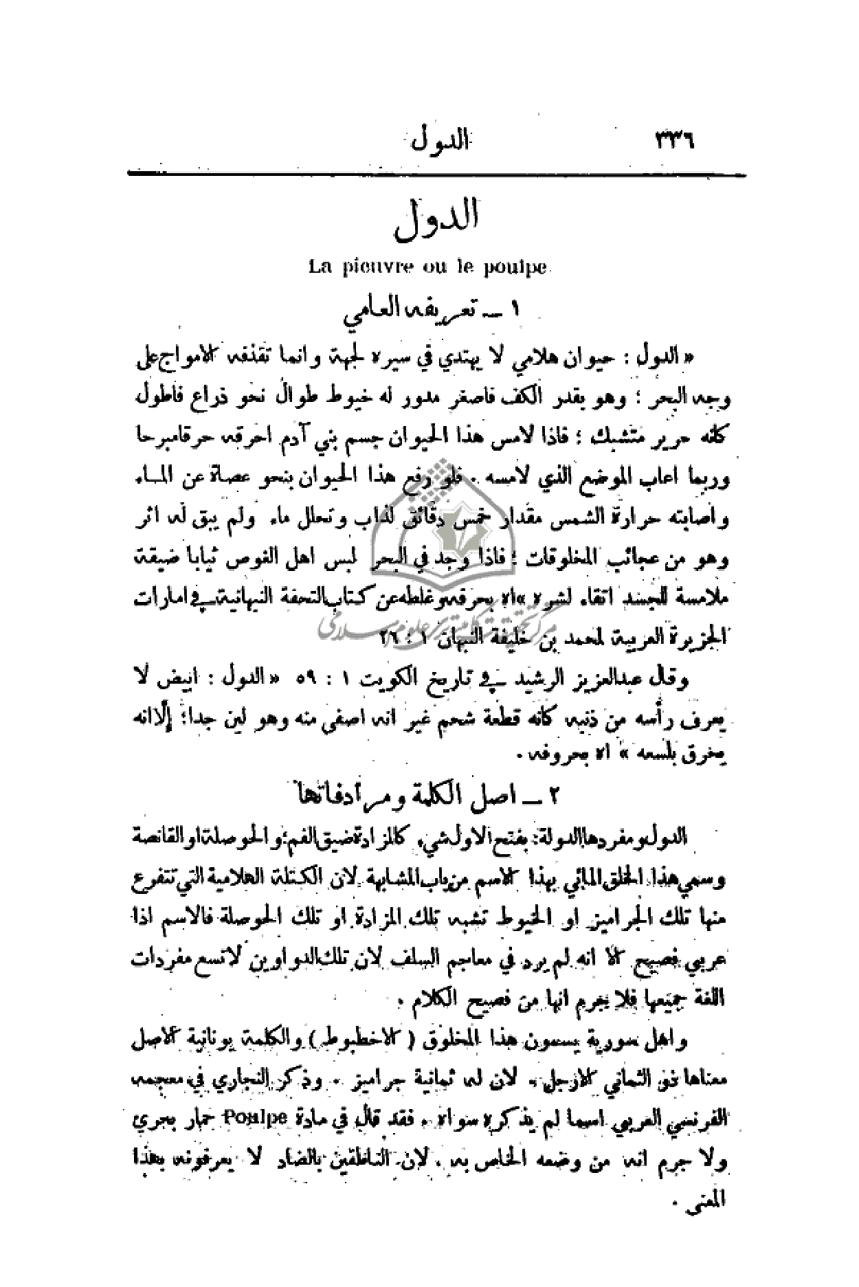 (الدول: حيوان هلامي لا يهتدي في سيره لجهة وإنما تقذفه الأمواج على وجه البحر؛ وهو بقدر الكف فأصغر مدور له خيوط طوال نحو ذراع فأطول كأنه حرير متشبك؛ فإذا لامس هذا الحيوان جسم بني آدم أحرقه حرقا مبرحا وربما اعاب الموضع الذي لامسه. فلو رفع هذا الحيوان بنحو عصاة عن الماء أصابته حرارة الشمس مقدار خمس دقائق لذاب وتحلل ماء ولم يبق له أثر وهو من عجائب المخلوقات؛ فإذا وجد في البحر لبس أهل الغوص ثيابا ضيقة ملامسة للجسد اتقاء لشره) اه بحرفه وغلطه عن كتاب التحفة النبهانية في إمارات الجزيرة العربية لمحمد بن خليفة النبهان 26: 1