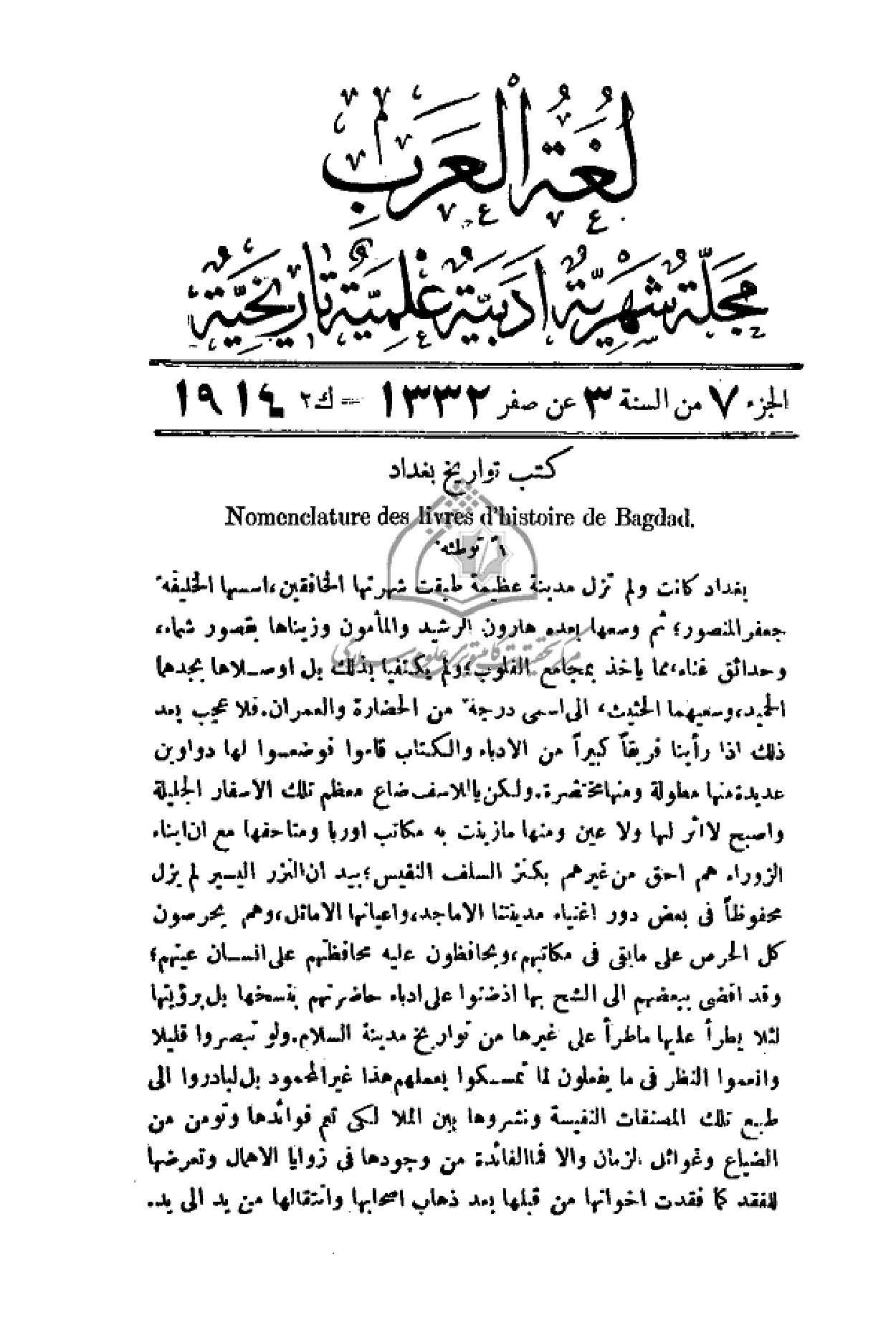بغداد كانت ولم تزل مدينة عظيمة طبقت شهرتها الخافقين، أسسها الخليفة جعفر المنصور؛ ثم وسعها بعده هارون الرشيد والمأمون وزيناها بقصور شماء، وحدائق غناء، مما يأخذ بمجامع القلوب؛ ولم يكتفيا بذلك بل أوصلاها بجدهما الحميد، وسعيهما الحثيث، إلى أسمى درجة من الحضارة والعمران. فلا عجب بعد ذلك إذا رأينا فريقاً كبيراً من الأدباء والكتاب قاموا فوضعوا لها دواوين عديدة منها مطولة ومنها مختصرة. ولكن يا للأسف ضاع معظم تلك الأسفار الجليلة وأصبح لا أثر لها ولا عين ومنها ما زينت به مكاتب أوربا ومتاحفها مع أن أبناء الزوراء هم أحق من غيرهم بكنز السلف النفيس؛ بيد أن النزر اليسير لم يزل محفوظاً في بعض دور أغنياء مدينتنا الاماجد، وأعيانها الأماثل، وهم يحرصون كل الحرص على ما بقى في مكاتبهم، ويحافظون عليه محافظتهم على إنسان عينهم؛ وقد أفضى ببعضهم إلى الشح بها إذ ضنوا على أدباء حاضرتهم بنسخها بل برؤيتها لئلا يطرأ عليها ما طرأ على غيرها من تواريخ مدينة السلام. ولو تبصروا قليلا وأنعموا النظر في ما يفعلون لما تمسكوا بعملهم هذا غير المحمود بل لبادروا إلى الضياع وغوائل الزمان وإلا فما الفائدة من وجودها في زوايا الإهمال وتعرضها للفقد كما فقدت أخواتها من قبلها بعد ذهاب أصحابها وانتقالها من يد إلى يد.