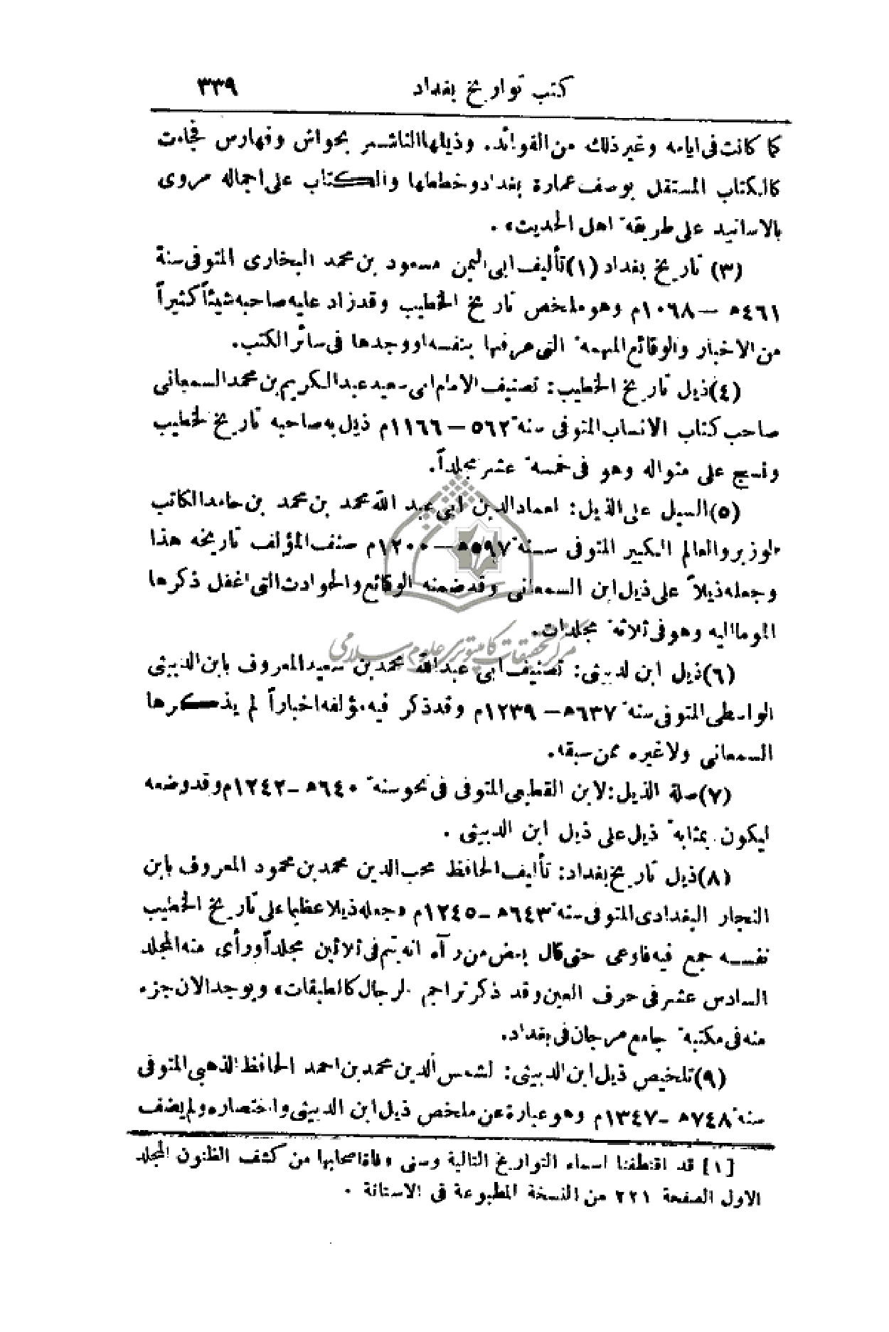 (9) - تلخيص ذيل ابن الدبيثي: لشمس الدين محمد بن أحمد الحافظ الذهبي المتوفى سنة 748هـ - 1347م وهو عبارة عن ملخص ذيل ابن الدبيثي واختصاره ولم يضف