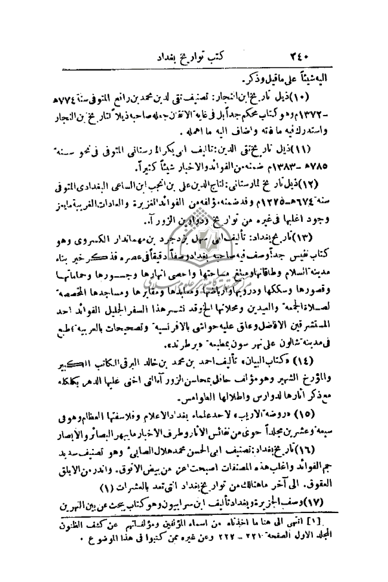(10) - ذيل تاريخ ابن النجار: تصنيف تقي الدين محمد بن رافع المتوفى سنة 774هـ - 1372م وهو كتاب محكم جداً بل في غاية الإتقان جعله ذيلاً لتاريخ ابن النجار واستدرك فيه ما فاته وأضاف إليه ما أهمله.