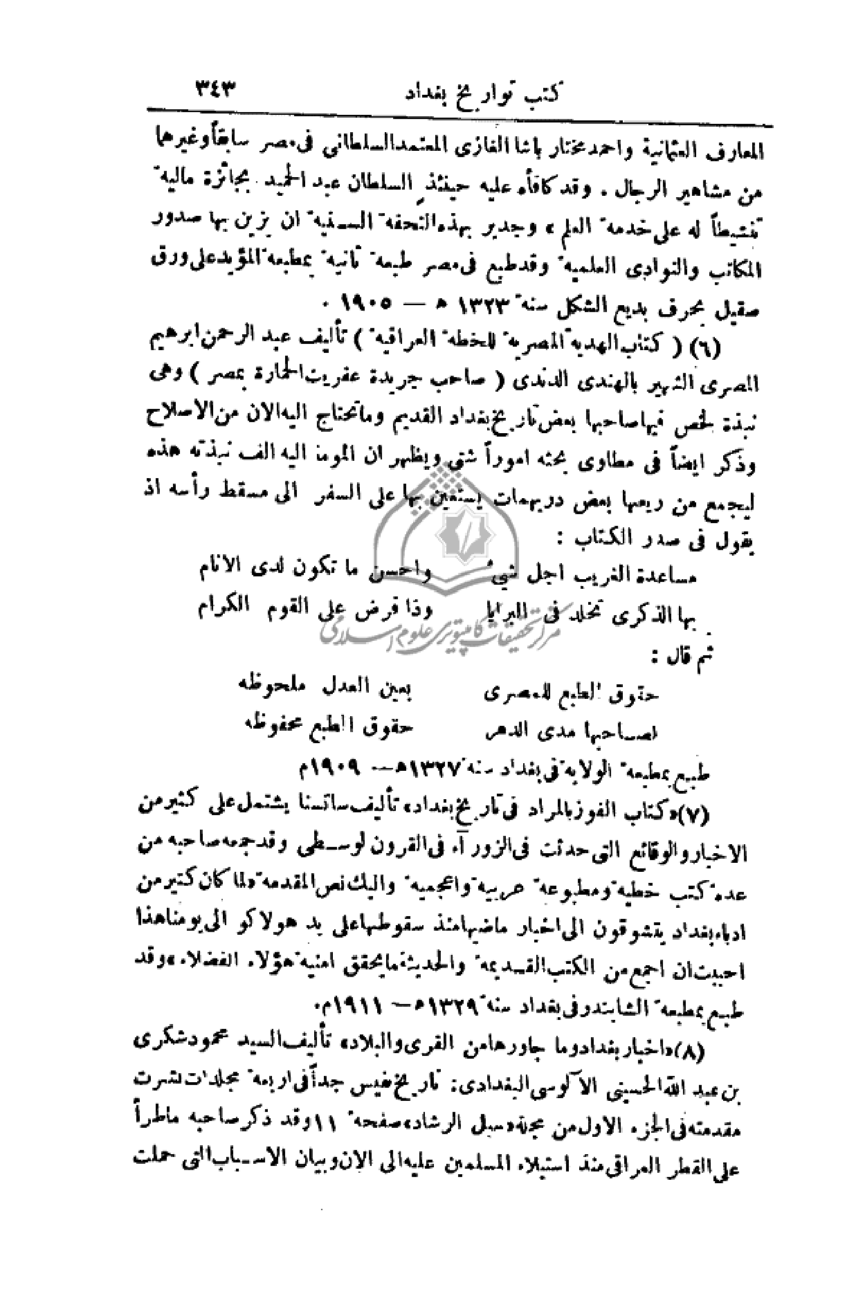 طبع بمطبعة الولاية في بغداد سنة 1327هـ - 1909م.