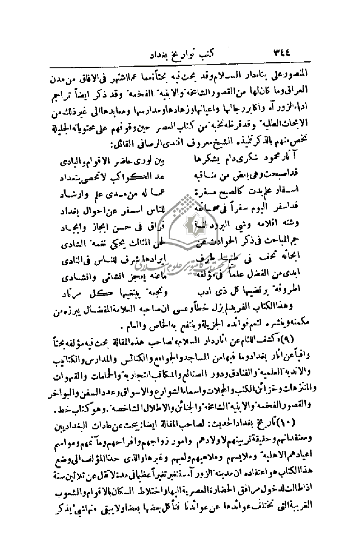 المنصور على بناء دار السلام وقد بحث فيه بحثاً نعما عما أشتهر في الأفاق من مدن العراق وما كان لها من القصور الشامخة والأبنية الفخمة وقد ذكر أيضاً تراجم أدباء الزوراء وأكابر رجالها وأعيانها وزهادها ومدارسها ومعابدها إلى غير ذلك من الأبحاث الطلية وقد قرظه نخبة من كتاب العصر حين وقوفهم على محتوياته الجليلة نخص منهم بالذكر تلميذه الشيخ معروف أفندي الرصافي القائل:
