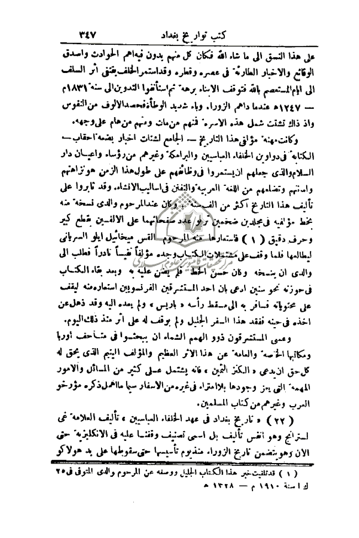 (22) - (تاريخ بغداد في عهد الخلفاء العباسيين) تأليف العلامة غي لسترانج وهو نفس تأليف بل أسمى تصنيف وقفنا عليه في الإنكليزية حتى الآن وهو يتضمن تاريخ الزوراء منذ يوم تأسيسها حتى سقوطها على يد هولاكو